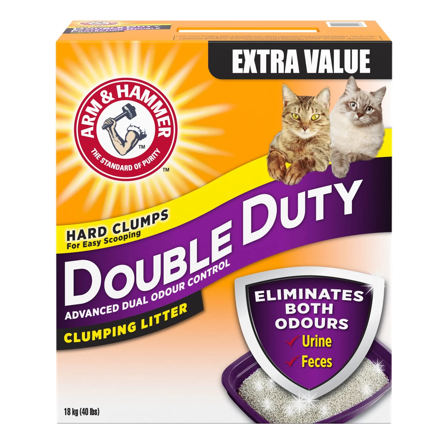 ARM & HAMMER Double Duty Clumping Litter eliminates both types of odours for Advanced Odour Control. Its breakthrough formula destroys urine AND feces odours instantly and helps keep your home smelling fresh and clean.