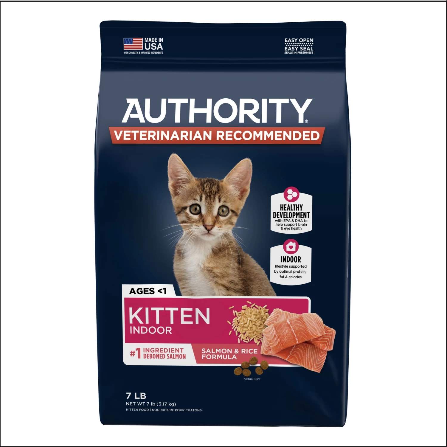 Provide your kitty with the nutrients needed to grow up healthy and strong by serving Authority Everyday Health Salmon & Rice Formula Dry Kitten Food. This delicious dry blend features great salmon taste in each and very bite, and provides optimal levels of nutrients including DHA, EPA, protein, and fat to help support growth and development.