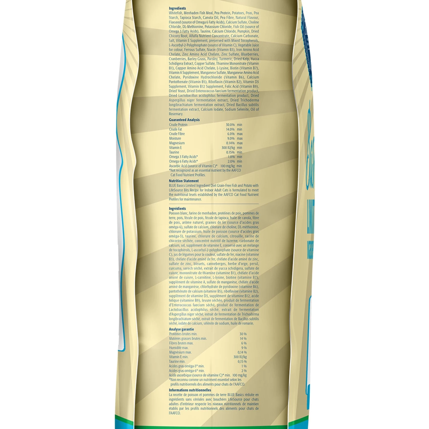Deboned Whitefish, Menhaden Fish Meal, Pea Protein, Potatoes, Peas, Pea Starch, Tapioca Starch, Canola Oil, Pea Fiber, Natural Flavor, Flaxseed (source of Omega 6 Fatty Acids), Calcium Sulfate, Choline Chloride, DL-Methionine, Potassium Chloride, Fish Oil (source of Omega 3 Fatty Acids), Taurine, Calcium Chloride, Pumpkin, Dried Chicory Root, Alfalfa Nutrient Concentrate, Calcium Carbonate, Salt, Vitamin E Supplement, preserved with Mixed Tocopherols, L-Ascorbyl-2-Polyphosphate (source of Vitamin C), Vegetable Juice for color, Ferrous Sulfate, Niacin (Vitamin B3), Iron Amino Acid Chelate, Zinc Amino Acid Chelate, Zinc Sulfate, Blueberries, Cranberries, Barley Grass, Parsley, Turmeric, Dried Kelp, Yucca Schidigera Extract, Copper Sulfate, Thiamine Mononitrate (Vitamin B1), Copper Amino Acid Chelate, L-Lysine, Biotin (Vitamin B7), Vitamin A Supplement, Manganese Sulfate, Manganese Amino Acid Chelate, Pyridoxine Hydrochloride (Vitamin B6), Calcium Pantothenate (Vitamin B5), Riboflavin (Vitamin B2), Vitamin D3 Supplement, Vitamin B12 Supplement, Folic Acid (Vitamin B9), Dried Yeast, Dried Enterococcus faecium fermentation product, Dried Lactobacillus acidophilus fermentation product, Dried Aspergillus niger fermentation extract, Dried Trichoderma longibrachiatum fermentation extract, Dried Bacillus subtilis fermentation extract, Calcium Iodate, Sodium Selenite, Oil of Rosemary