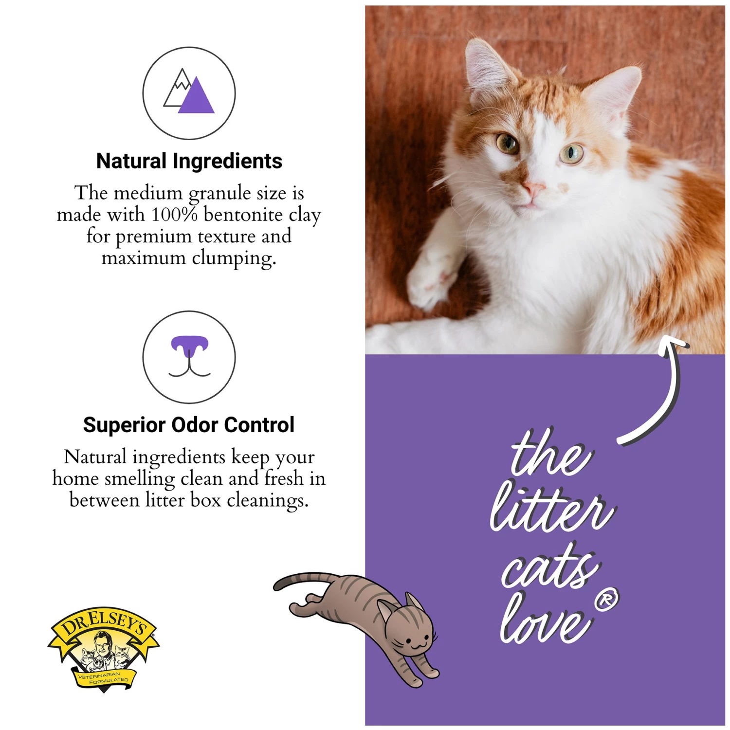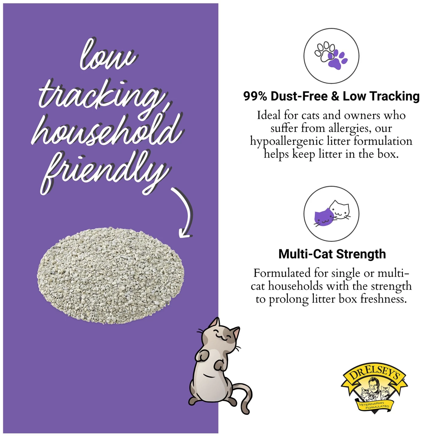 Fill clean, dry litter box with 3-4 inches of Dr. Elsey’s litter. This depth allows your cats to dig and cover their waste naturally. Scoop waste twice daily and refill box as necessary. Replace entire box once a month.