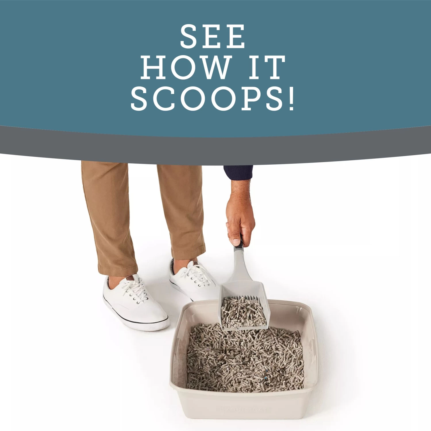 Fill a moisture-proof litter pan with 3″ – 4″ of cat litter to allow for pawing and covering.