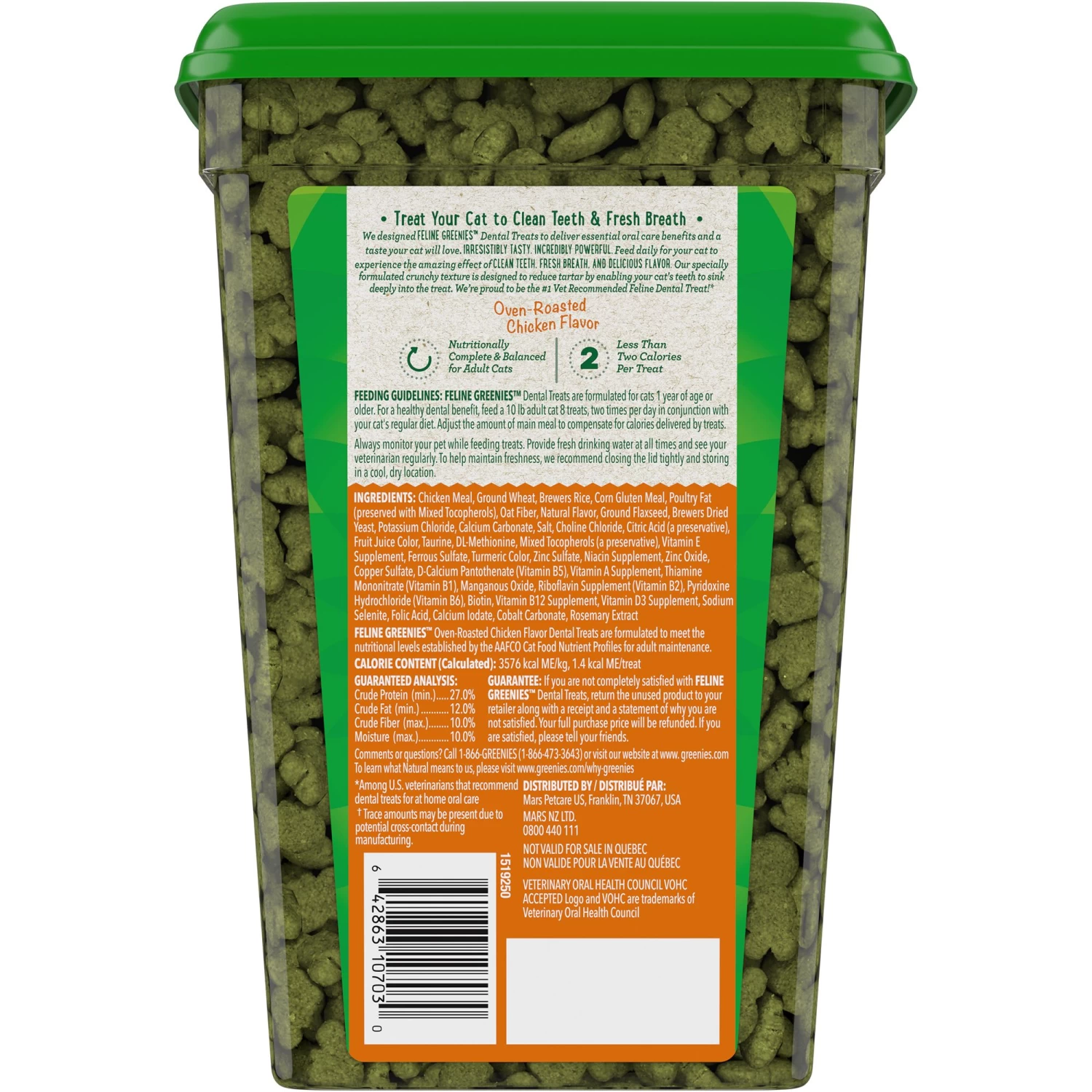 FELINE GREENIES Oven Roasted Chicken Flavor Dental Cat Treats were designed to help keep your cat’s teeth clean and healthy. The crunchy texture of these irresistible cat snacks helps clean teeth, reduce tartar buildup, and freshen cat breath, letting you enjoy cuddle time even more. Made with natural ingredients plus vitamins, minerals, and other nutrients, these tasty treats are also nutritionally complete and balanced for adult cats. Plus, FELINE GREENIES Dental Treats contain less than 2 calories per treat and are the #1 vet-recommended feline dental treat.* Give your cat FELINE GREENIES Dental Treats and you’re sure to hear happy purrs of joy. FELINE GREENIES Daily Dental Treats… for healthy and happy dental care. * Among U.S. veterinarians who recommend dental treats for at-home oral care