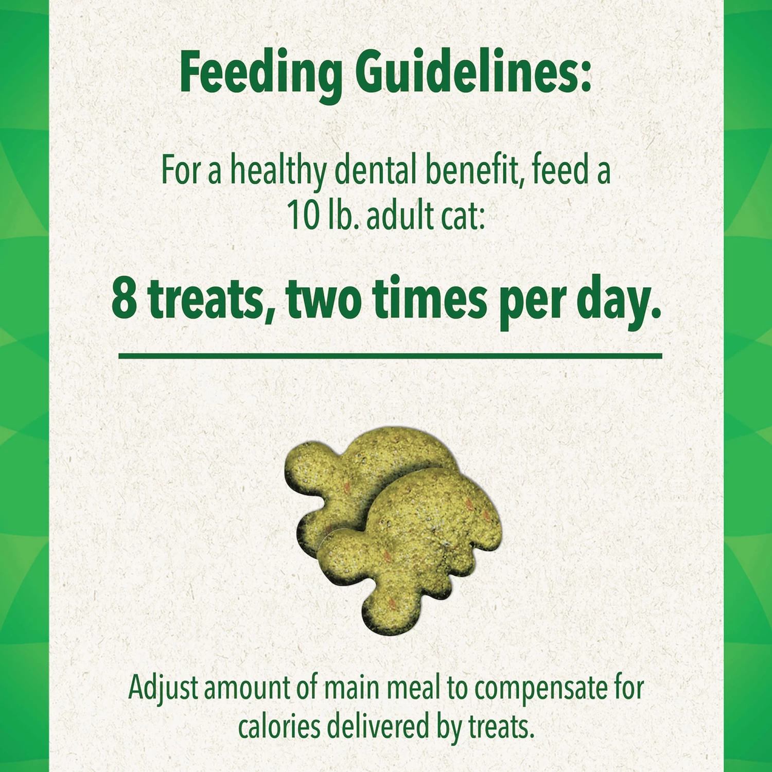 FELINE GREENIES Dental Treats are formulated for cats 1 year of age or older. For a healthy dental benefit, feed a 10 lb adult cat 8 treats, two times per day in conjunction with your cat’s regular diet. Adjust the amount of main meal to compensate for calories delivered by treats. Always monitor your pet while feeding treats. Provide fresh drinking water at all times and see your veterinarian regularly. To help maintain freshness, we recommend closing the lid tightly and storing in a cool, dry location.