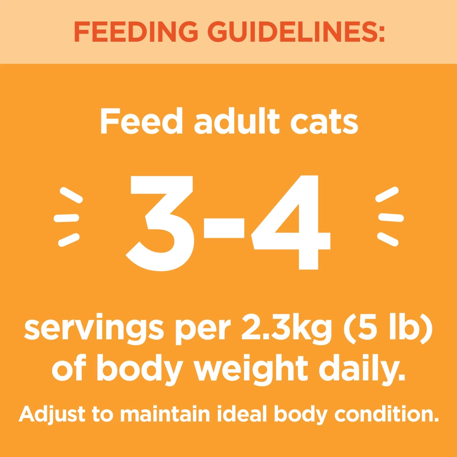Feed adult cats 3-4 servings per 5 pounds of body weight daily. Adjust to maintain ideal body condition.