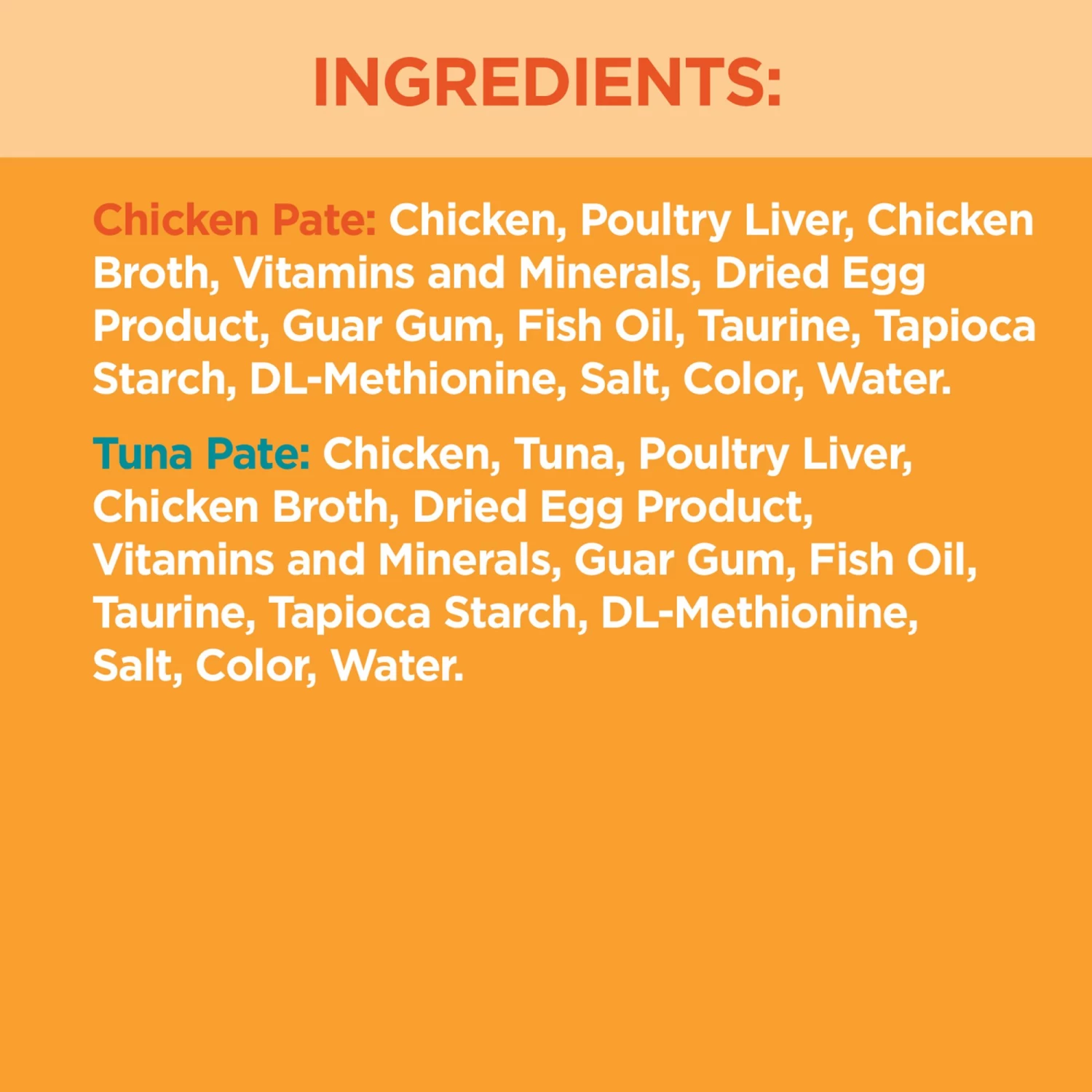 Chicken, Tuna, Poultry Liver, Chicken Broth, Dried Egg Product, Vitamins And Minerals, Guar Gum, Fish Oil, Taurine, Tapioca Starch, Dl-Methionine, Salt, Color, Water