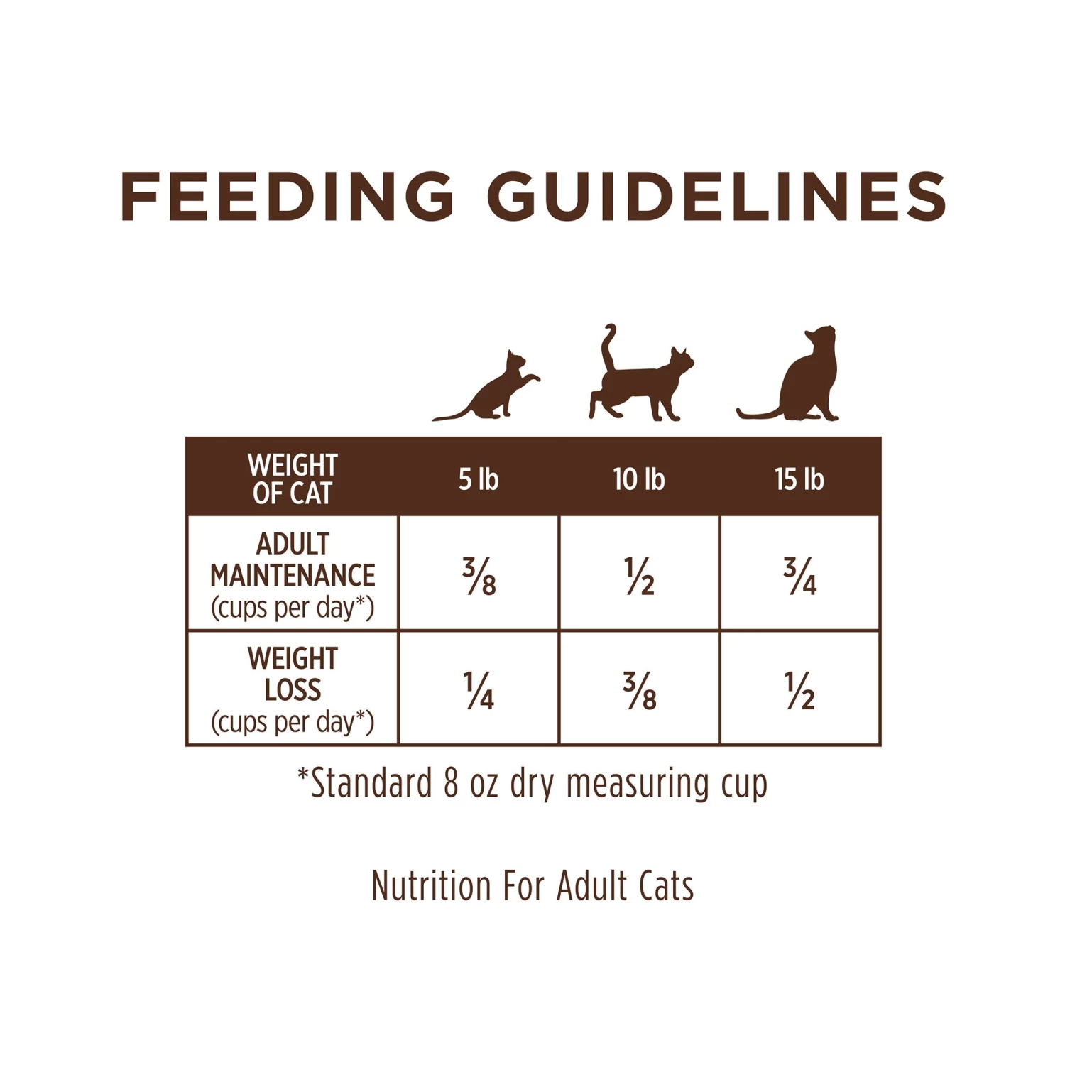 Adult Maintenance (cups per day): 5 lb: 3/8 cup; 10 lb: 1/2 cup; 15 lb: 3/4 cup