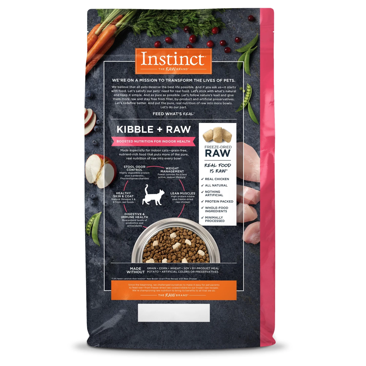 High animal-protein, grain-free, and offering boosted nutrition with bites of freeze-dried raw meat, Instinct Raw Boost Grain-Free Recipe with Real Chicken for Indoor Health is a better way to feed kibble. Unlock your cat’s potential to thrive and put more of the pure, real nutrition of raw into every bowl. Available Varieties: Indoor Health, Healthy Weight. Instinct Raw Boost Grain-Free Recipe with Real Chicken for Indoor Health is formulated to meet the nutritional levels established by the AAFCO Cat Food Nutrient Profiles for all life stages. All Instinct products are 100% Satisfaction Guaranteed. If you or your pet are not completely satisfied with this or any Instinct product, simply return the unused portion, along with the original sales receipt, to the retailer for a complete refund or replacement.