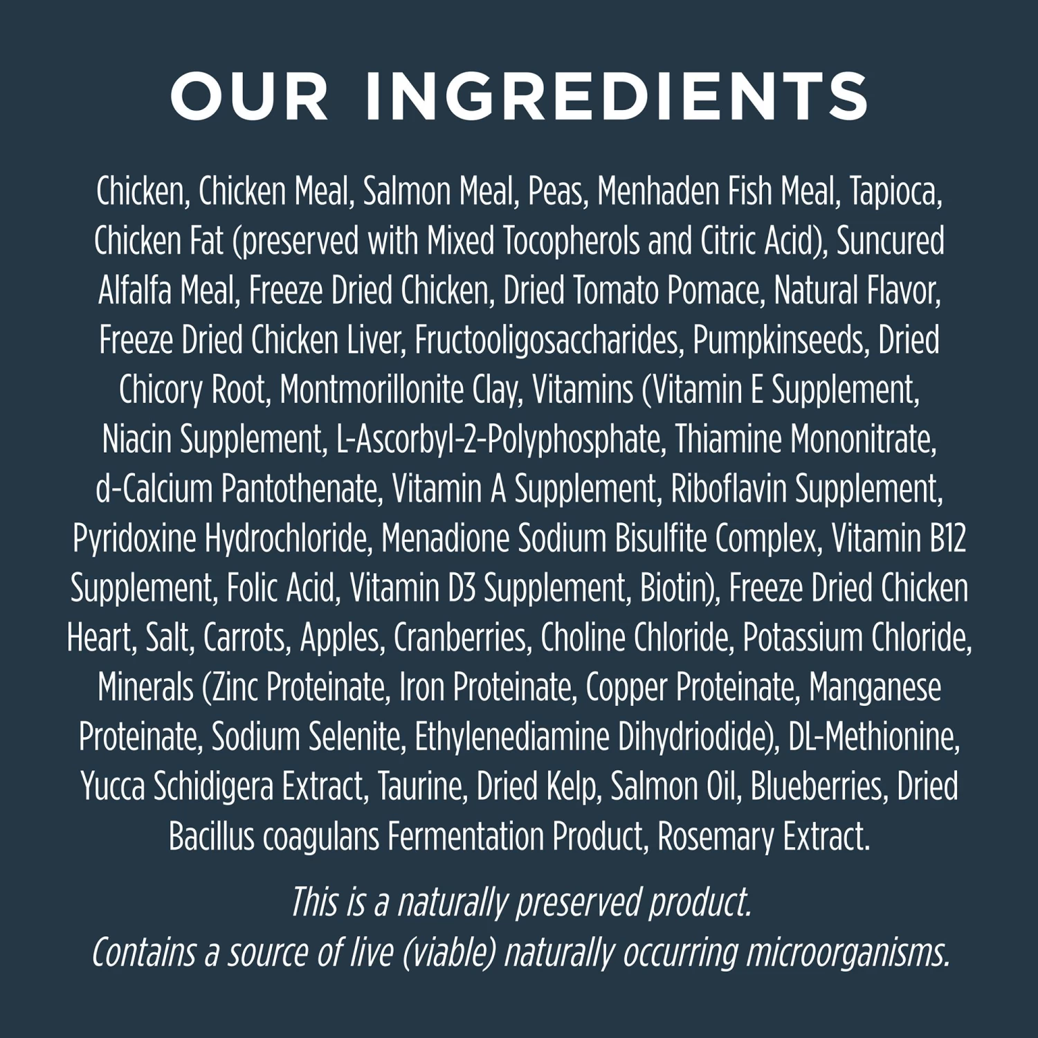 Chicken, Chicken Meal, Salmon Meal, Peas, Menhaden Fish Meal, Tapioca, Chicken Fat (preserved with Mixed Tocopherols and Citric Acid), Suncured Alfalfa Meal, Freeze Dried Chicken, Dried Tomato Pomace, Natural Flavor, Freeze Dried Chicken Liver, Fructooligosaccharides, Pumpkinseeds, Dried Chicory Root, Montmorillonite Clay, Vitamins (Vitamin E Supplement, Niacin Supplement, L-Ascorbyl-2-Polyphosphate, Thiamine Mononitrate, d-Calcium Pantothenate, Vitamin A Supplement, Riboflavin Supplement, Pyridoxine Hydrochloride, Menadione Sodium Bisulfite Complex, Vitamin B12 Supplement, Folic Acid, Vitamin D3 Supplement, Biotin), Freeze Dried Chicken Heart, Salt, Carrots, Apples, Cranberries, Choline Chloride, Potassium Chloride, Minerals (Zinc Proteinate, Iron Proteinate, Copper Proteinate, Manganese Proteinate, Sodium Selenite, Ethylenediamine Dihydriodide), DL-Methionine, Yucca Schidigera Extract, Taurine, Dried Kelp, Salmon Oil, Blueberries, Dried Bacillus coagulans Fermentation Product, Rosemary Extract