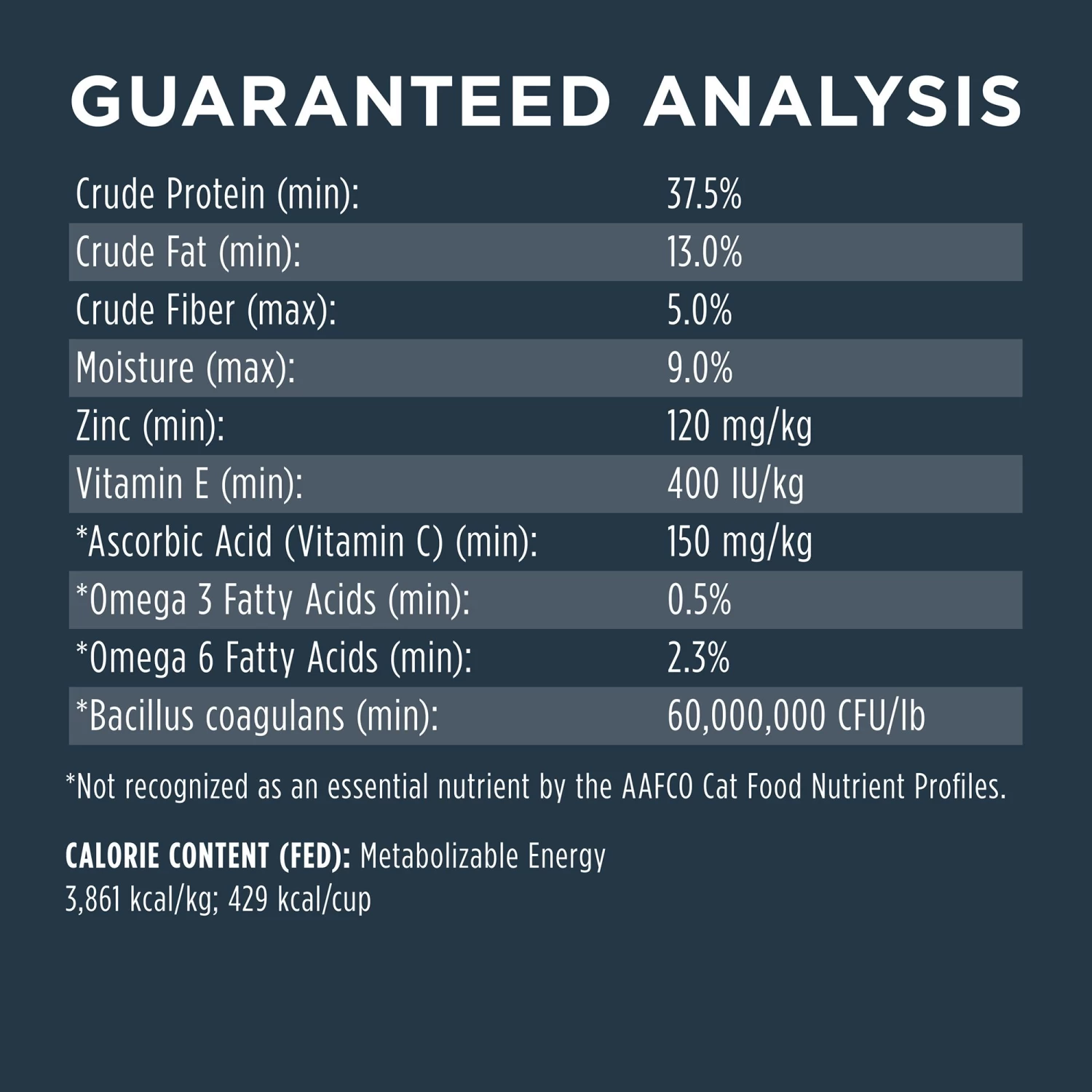 Crude Protein (min): 37.5%, Crude Fat (min): 13.0%, Crude Fiber (max): 5.0%, Moisture (max): 9.0%, Zinc (min): 120 mg/kg, Vitamin E (min): 400 IU/kg, *Ascorbic Acid (Vitamin C) (min): 150 mg/kg, *Omega 3 Fatty Acids (min): 0.5%, *Omega 6 Fatty Acids (min): 2.3%, *Bacillus coagulans (min): 60,000,000 CFU/lb, *Not recognized as an essential nutrient by the AAFCO Cat Food Nutrient Profiles.