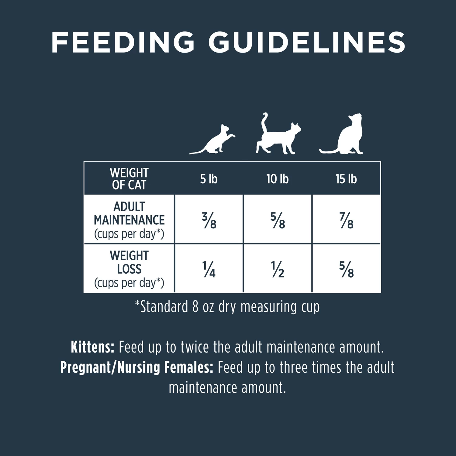 Weight Loss (cups per day): 5 lb: 1/4 cup; 10 lb: 1/2 cup; 15 lb: 5/8 cup