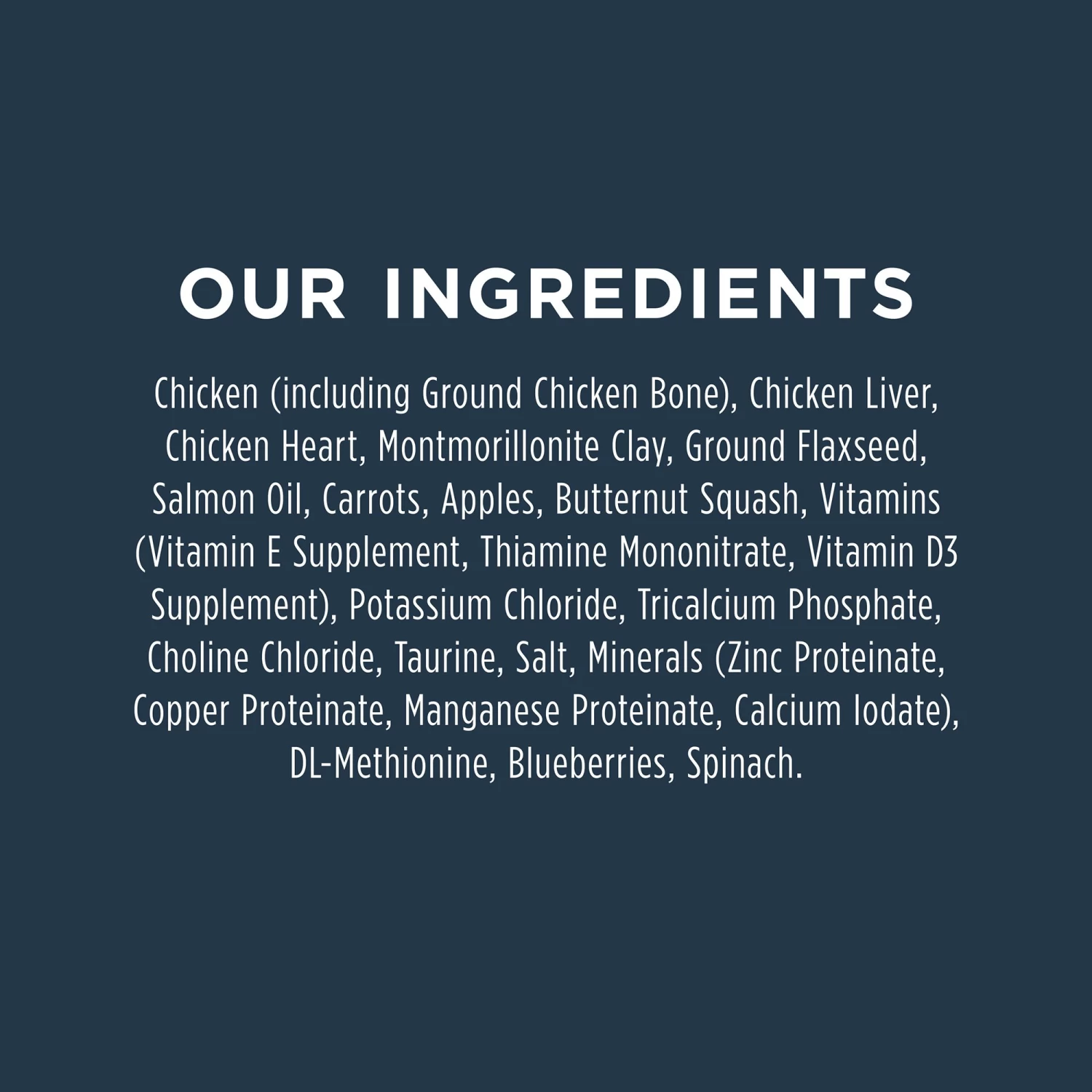 Pollock, Beef Spleen, Beef Kidney, Beef Liver, Beef, Ground Flaxseed, Salmon Oil, Yeast Culture, Montmorillonite Clay, Ground Miscanthus Grass, Carrots, Apples, Butternut Squash, Blueberries, Spinach, Vitamins (Vitamin E Supplement, Thiamine Mononitrate, Vitamin D3 Supplement), Salt, Tricalcium Phosphate, Choline Chloride, Taurine, Potassium Chloride, Mixed Tocopherols (for freshness), Minerals (Zinc Proteinate, Copper Proteinate, Manganese Proteinate, Calcium Iodate), Rosemary Extract