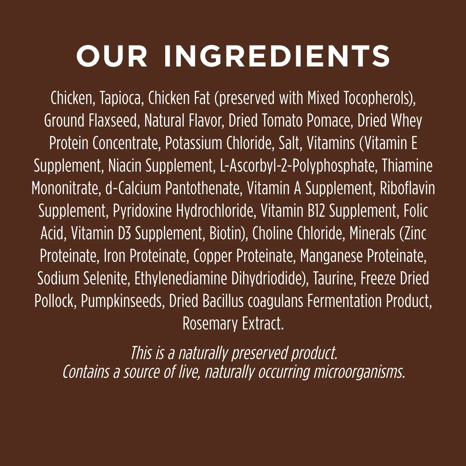 Chicken, Tapioca, Chicken Fat (preserved with Mixed Tocopherols), Ground Flaxseed, Natural Flavor, Dried Tomato Pomace, Dried Whey Protein Concentrate, Potassium Chloride, Salt, Vitamins (Vitamin E Supplement, Niacin Supplement, L-Ascorbyl-2-Polyphosphate, Thiamine Mononitrate, d-Calcium Pantothenate, Vitamin A Supplement, Riboflavin Supplement, Pyridoxine Hydrochloride, Vitamin B12 Supplement, Folic Acid, Vitamin D3 Supplement, Biotin), Choline Chloride, Minerals (Zinc Proteinate, Iron Proteinate, Copper Proteinate, Manganese Proteinate, Sodium Selenite, Ethylenediamine Dihydriodide), Taurine, Freeze Dried Chicken, Freeze Dried Chicken Liver, Pumpkinseeds, Freeze Dried Chicken Heart, Dried Bacillus coagulans Fermentation Product, Rosemary Extract