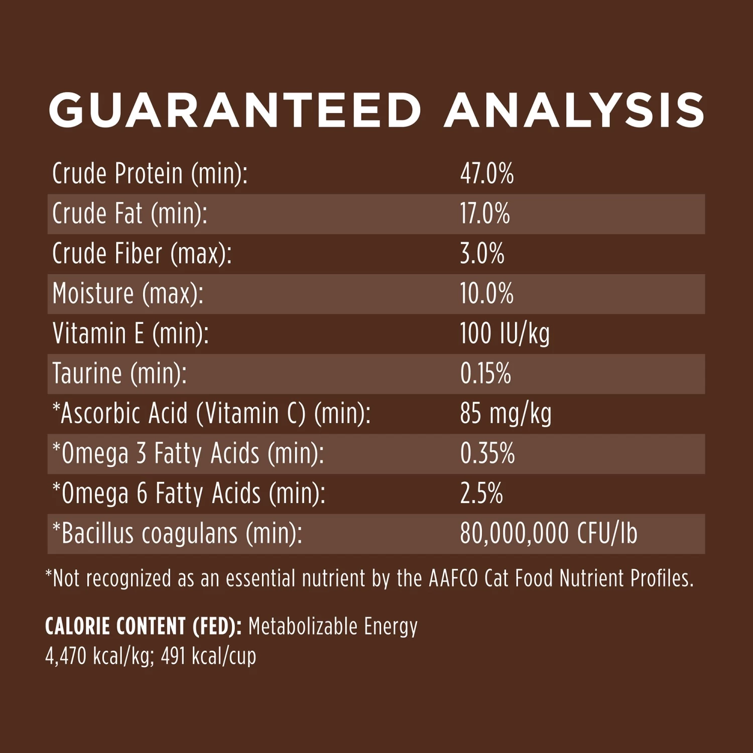 Crude Protein (min): 47.0%, Crude Fat (min): 17.0%, Crude Fiber (max): 3.0%, Moisture (max): 10.0%, Vitamin E (min): 100 IU/kg, Taurine (min): 0.15%, *Ascorbic Acid (Vitamin C) (min): 85 mg/kg, *Omega 3 Fatty Acids (min): 0.35%, *Omega 6 Fatty Acids (min): 2.5%, *Bacillus coagulans (min): 80,000,000 CFU/lb, *Not recognized as an essential nutrient by the AAFCO Cat Food Nutrient Profiles.