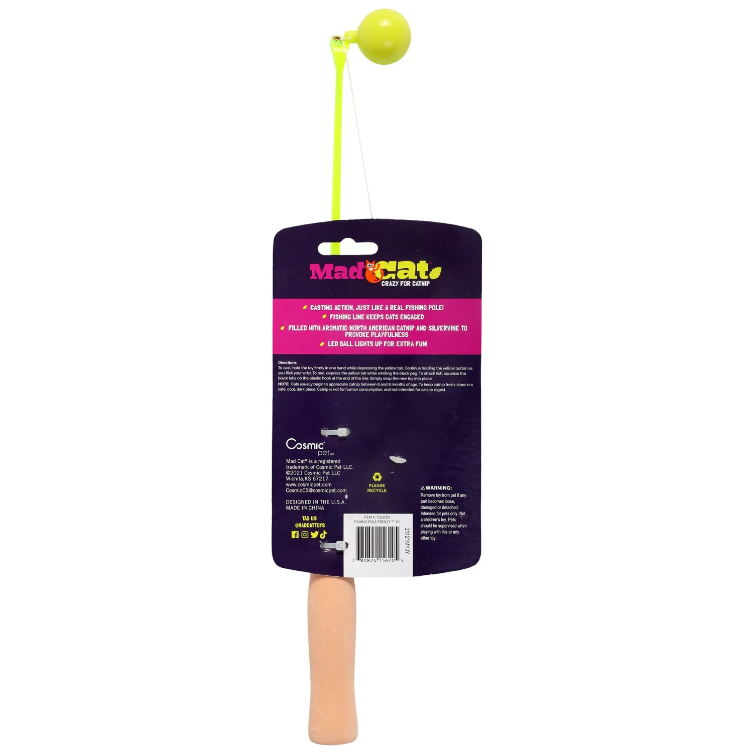 Ideal for interactive playtime, the Mad Cat Fishing Pole Frenzy Cat Wand combines the casting action of a real fishing rod with the allure of a plush catnip fish toy. The long teaser-wand handle of the rod allows for greater movement, resulting in more batting, chasing, pouncing and kicking! The LED light up ball attracts your cat’s attention for added engagement. Cast your cares away! Both you and your cat will have a reel-ly good time with the Mad Cat Fishing Pole Frenzy.