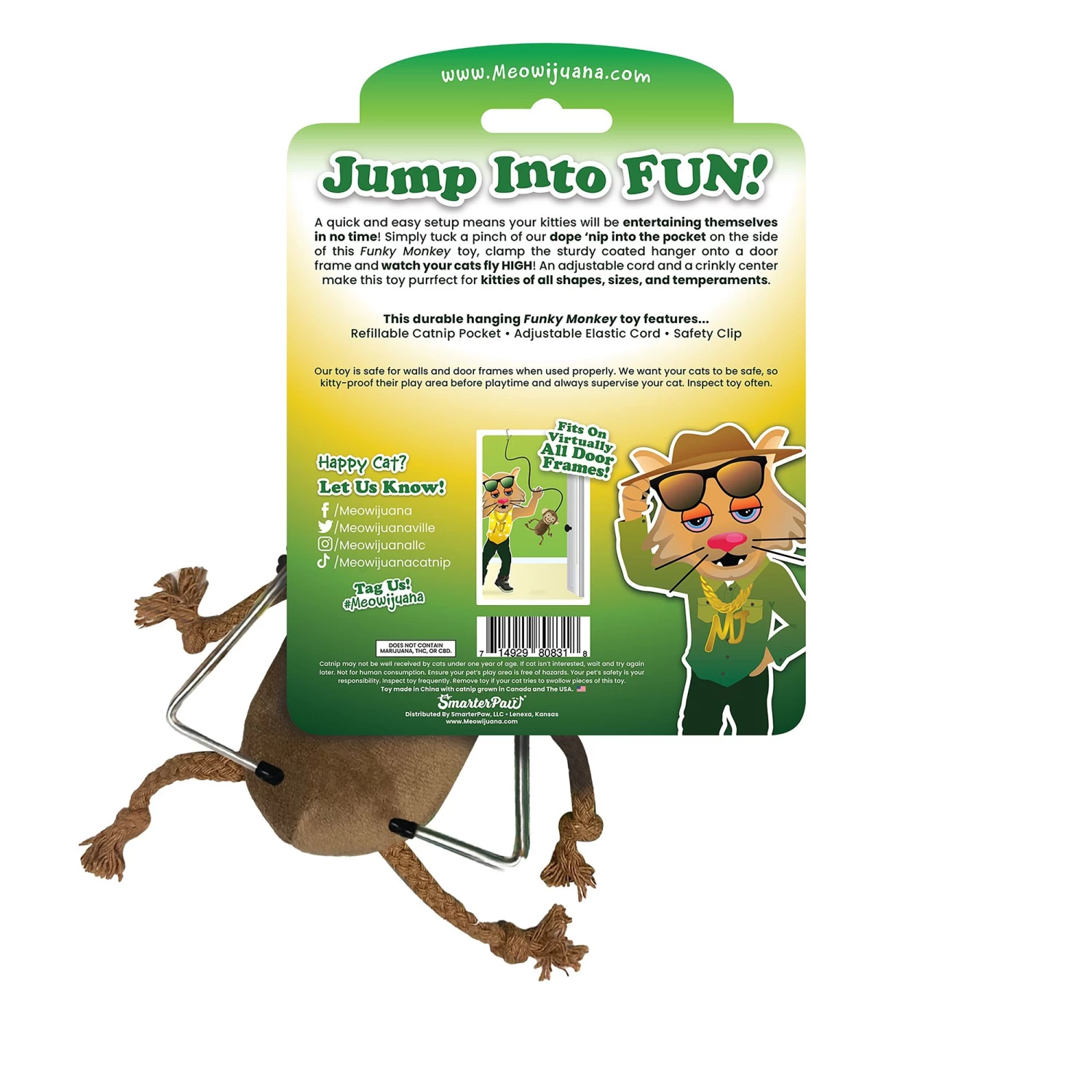 Simply tuck some of our dope ânip into the pocket on the side of this Jump ‘n’ Jamb Get the Monkey Off Your Back Refillable Door Jamb Cat Toy, clamp this sturdy coated hanger onto your door frame and watch your cats fly high! Our toy is safe for walls and door frames; used properly it won’t scratch. We want your cats safe, so kitty-proof their play area first. The cord is adjustable to fit any size play area and is sturdy enough for even the craziest of pawtiers.