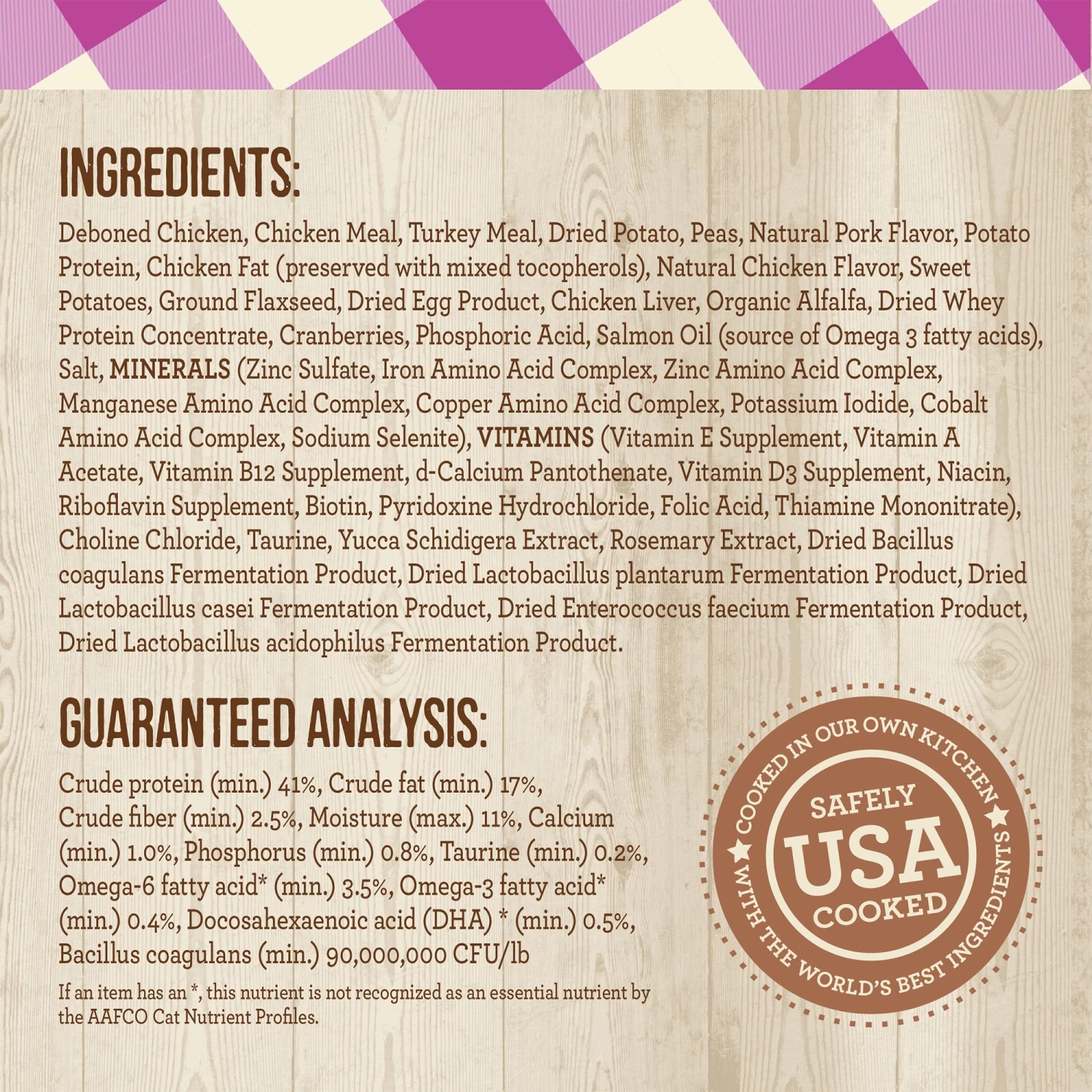 Deboned Chicken, Chicken Meal, Turkey Meal, Dried Potato, Peas, Natural Pork Flavor, Potato Protein, Chicken Fat (preserved with mixed tocopherols), Natural Chicken Flavor, Sweet Potatoes, Ground Flaxseed, Dried Egg Product, Chicken Liver, Organic Alfalfa, Dried Whey Protein Concentrate, Cranberries, Phosphoric Acid, Salmon Oil (source of Omega 3 fatty acids), Salt, Minerals (Zinc Sulfate, Iron Amino Acid Complex, Zinc Amino Acid Complex, Manganese Amino Acid Complex, Copper Amino Acid Complex, Potassium Iodide, Cobalt Amino Acid Complex, Sodium Selenite), Vitamins (Vitamin E Supplement, Vitamin A Acetate, Vitamin B12 Supplement, d-Calcium Pantothenate, Vitamin D3 Supplement, Niacin, Riboflavin Supplement, Biotin, Pyridoxine Hydrochloride, Folic Acid, Thiamine Mononitrate), Choline Chloride, Taurine, Yucca Schidigera Extract, Rosemary Extract, Dried Bacillus coagulans Fermentation Product, Dried Lactobacillus plantarum Fermentation Product, Dried Lactobacillus casei Fermentation Product, Dried Enterococcus faecium Fermentation Product, Dried Lactobacillus acidophilus Fermentation Product
