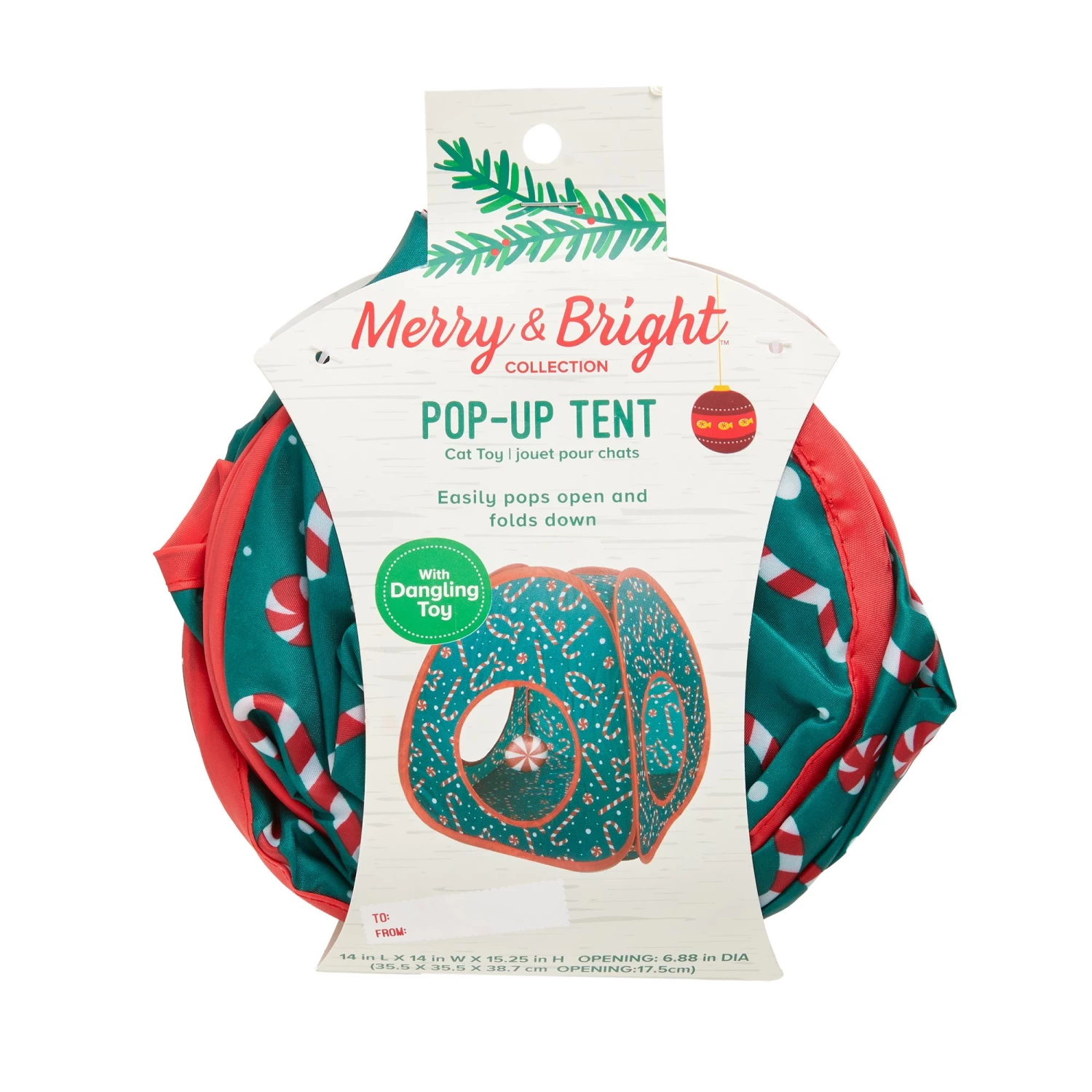 Your kitty will have a great exploring and playing in this Merry & Bright Candy Cane Pop-Up Tent. This fun play sack features a candy cane theme, and will keep your cat engaged and entertained with its attached dangling toy while also providing a place to find solitude. Only at PetSmart.