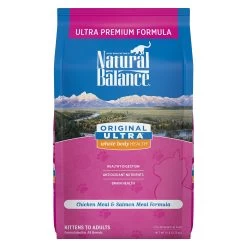 Give your kitty some nose-to-tail nutrition in every bowl with Natural Balance Original Ultra Whole Body Health Chicken Meal & Salmon Meal Formula Dry Cat Food. The ultra-premium formula covers all the nutritional bases to keep your kitty in his prime, with quality proteins from chicken and salmon for healthy, active muscles. It also contains antioxidants for healthy immunity, balanced fatty acids for a lustrous skin and coat, proper levels of minerals for strong bones, plus taurine and omegas for eye, heart and brain health. That’s a whole lot of healthy in every tasty, crunchy bite! Go ahead and fill his bowl for all-over well-being for adult cats and kittens, too.