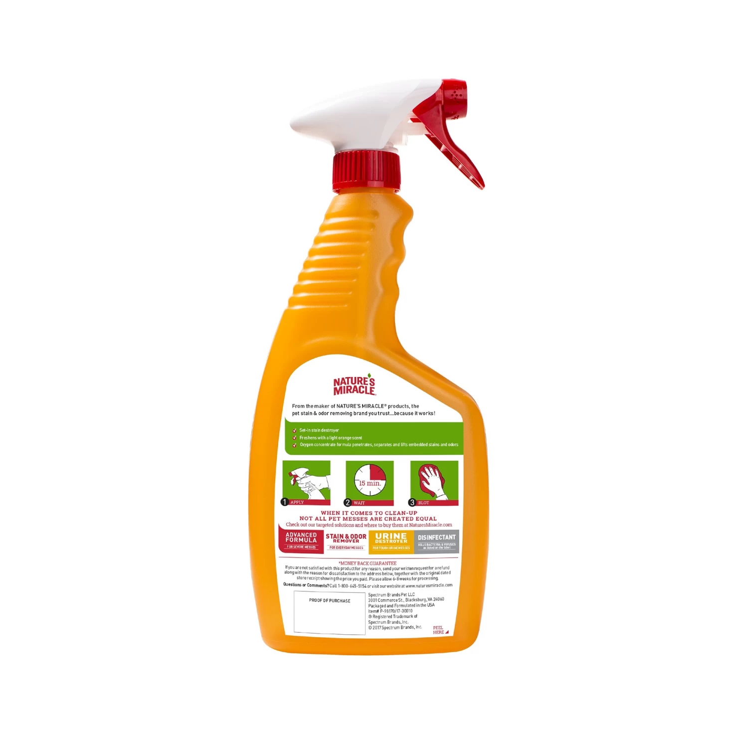 Directions: Before using, test surfaces to be treated for colorfastness by applying to a hiddenarea. Wait 5 minutes, then wipe with a white cloth. If color is removed from the test area, do not use product on those surfaces. Do not use on untreated hardwood, leather, suede, silk or wool specialty fabrics. Always use this product at full strength. Just apply, wait 15 minutes, then blot up stain with a white cloth. When used and stored as directed, this product is safe to use around your pets and in your home. Also use Nature&339;s Miracle Set-In Stain Destroyer before washing clothing – saturate stained areas with this product at full strength before starting your washer cycle. Let the item set for up to 5 minutes, then wash as usual per fabric label directions. Always use Nature&339;s Miracle products first. Other cleaners and detergents may fail and chemically “set” stains that will be impossible to remove.