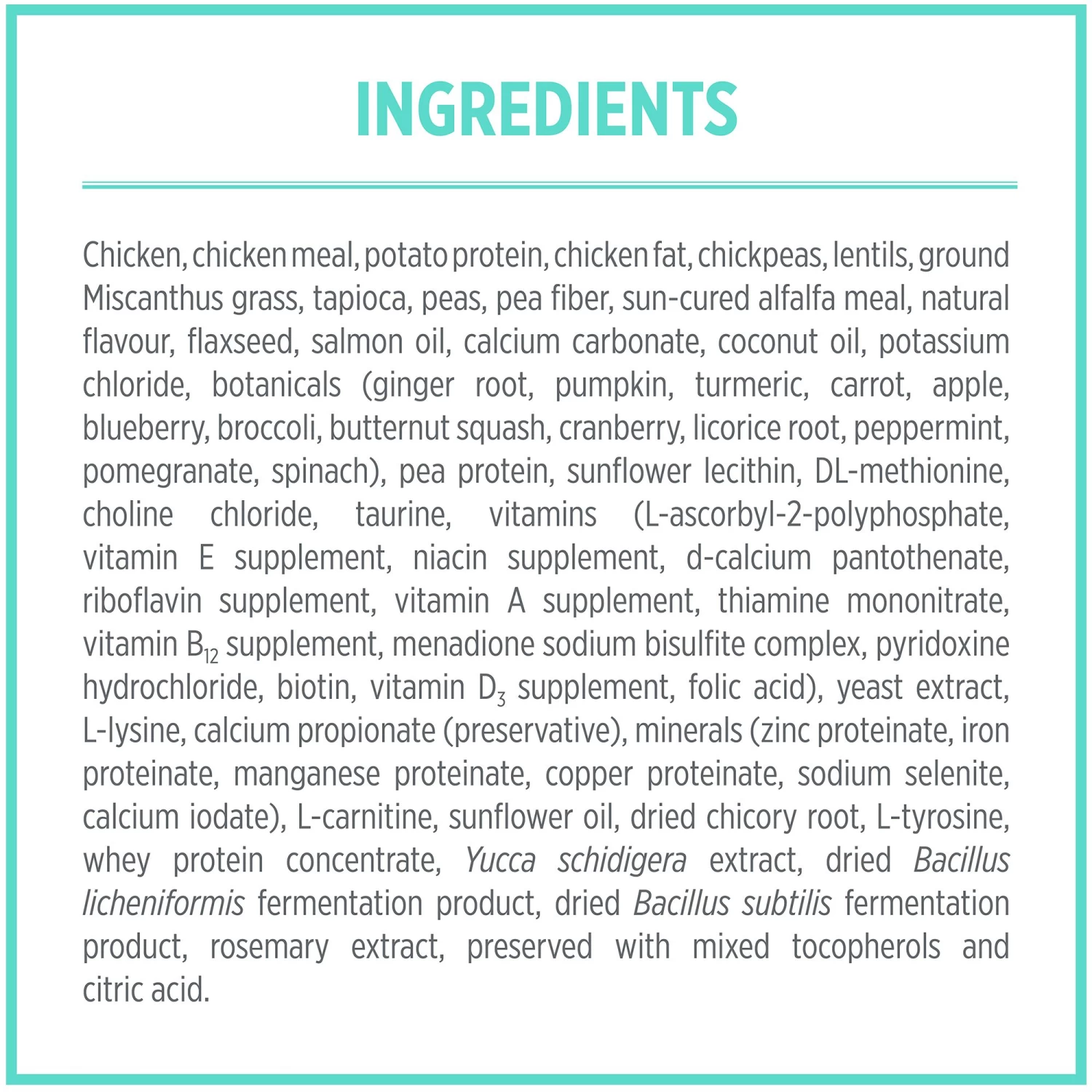 Tocopherols), Sun-Cured Alfalfa Meal, Tapioca, Peas, Pea Fiber, Sun-Cured Ground Miscanthus Grass, Natural Chicken Flavour, Tricalcium Phosphate, Flaxseed, Coconut Oil, Chickpeas, Lentils, Potassium Chloride, Botanicals (Ginger Root, Pumpkin, Turmeric, Carrot, Apple, Blueberry, Broccoli, Cranberry, Licorice Root, Peppermint Leaf, Pomegranate, Butternut Squash, Spinach), Salmon Oil, Sunflower Lecithin, Salt, Choline Chloride, Sodium Bisulfate, Minerals (Zinc Sulfate, Ferrous Sulfate, Zinc Proteinate, Manganese Sulfate, Iron Proteinate, Copper Sulfate, Manganese Proteinate, Sodium Selenite, Copper Proteinate, Calcium Iodate), Taurine, DL-Methionine, Vitamins [L-Ascorbyl-2-Polyphosphate (Source