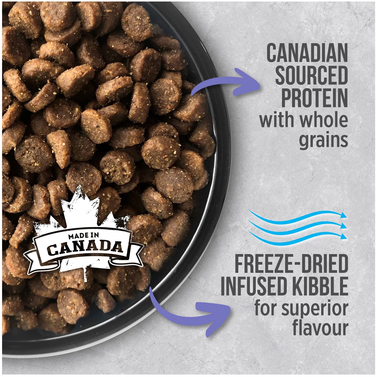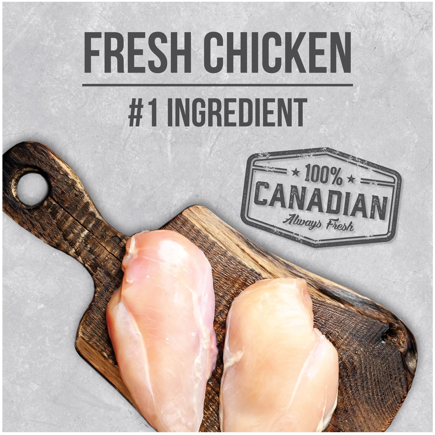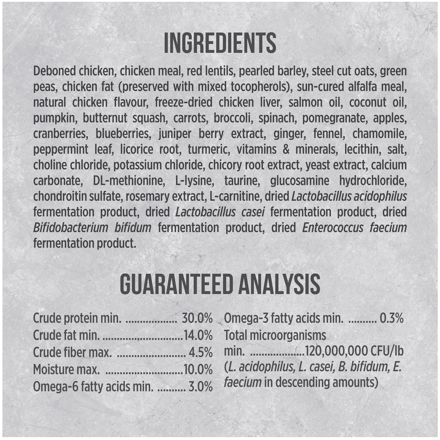 Deboned Chicken, Chicken Meal, Red Lentils, Pearled Barley, Steel Cut Oats, Green Peas, Chicken Fat (Preserved With Mixed Tocopherols), Sun-Cured Alfalfa Meal, Natural Chicken Flavour, Freeze-Dried Chicken Liver, Salmon Oil, Coconut Oil, Pumpkin, Butternut Squash, Carrots, Broccoli, Spinach, Pomegranate, Apples, Cranberries, Blueberries, Juniper Berry Extract, Ginger, Fennel, Chamomile, Peppermint Leaf, Licorice Root, Turmeric, Vitamins (Vitamin E Supplement, Vitamin A Supplement, Niacin, Calcium Pantothenate, Riboflavin, Pyridoxine Hydrochloride, Thiamine Mononitrate, Biotin, Vitamin B12 Supplement, Vitamin D3 Supplement, Folic Acid), Minerals (Zinc Sulfate, Zinc Proteinate, Iron Proteinate, Ferrous Sulfate, Copper Proteinate, Copper Sulfate, Manganese Proteinate, Manganous Oxide, Calcium Iodate, Sodium Selenite), Lecithin, Salt, Choline Chloride, Potassium Chloride, Chicory Root Extract, Yeast Extract, Calcium Carbonate, DL-Methionine, L-Lysine, Taurine, Glucosamine Hydrochloride, Chondroitin Sulfate, Rosemary Extract, L-Carnitine, Dried Lactobacillus Acidophilus Fermentation Product, Dried Lactobacillus Casei Fermentation Product, Dried Bifidobacterium Bifidum Fermentation Product, Dried Enterococcus Faecium Fermentation Product
