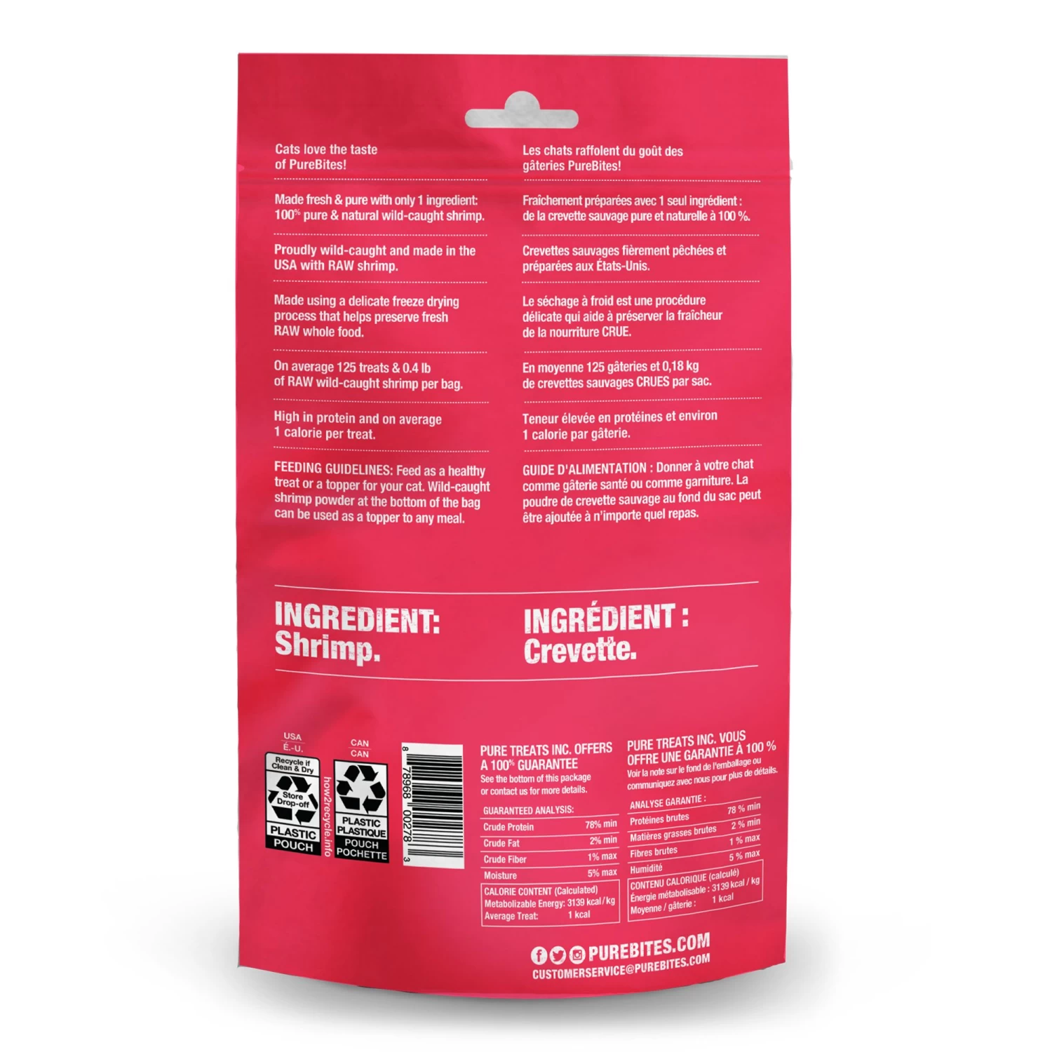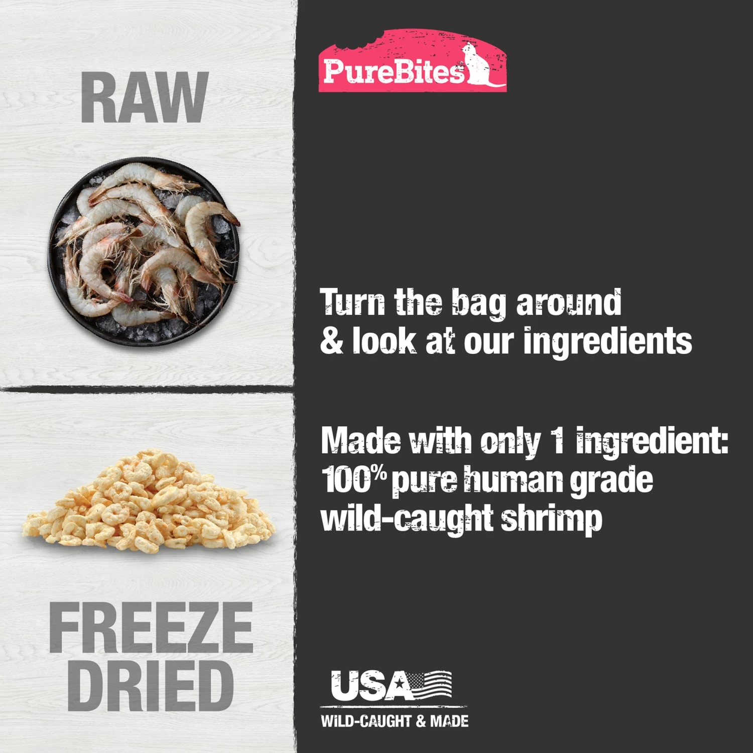 At PureBites, we’re always asking pet parents to “Go ahead, look at our ingredients.” PureBites RAW freeze-dried shrimp cat treats are the ultimate high-value limited ingredient treat or topper. Made with only 1 simple human grade ingredient you can read, pronounce, and trust: 100% pure wild-caught shrimp. Nothing else. No artificial colours, fillers, or sweeteners. Proudly sourced and made using a delicate freeze-drying process that helps preserve fresh RAW whole food, locking in the taste cats crave and the high protein / low calorie nutrition that pet parents love. Freeze dried treats are a great compliment to a RAW diet since they retain many of the benefits of RAW without the hassle of refrigeration. PureBites is a proudly Canadian company treating and feeding pets from coast to coast since 2005.