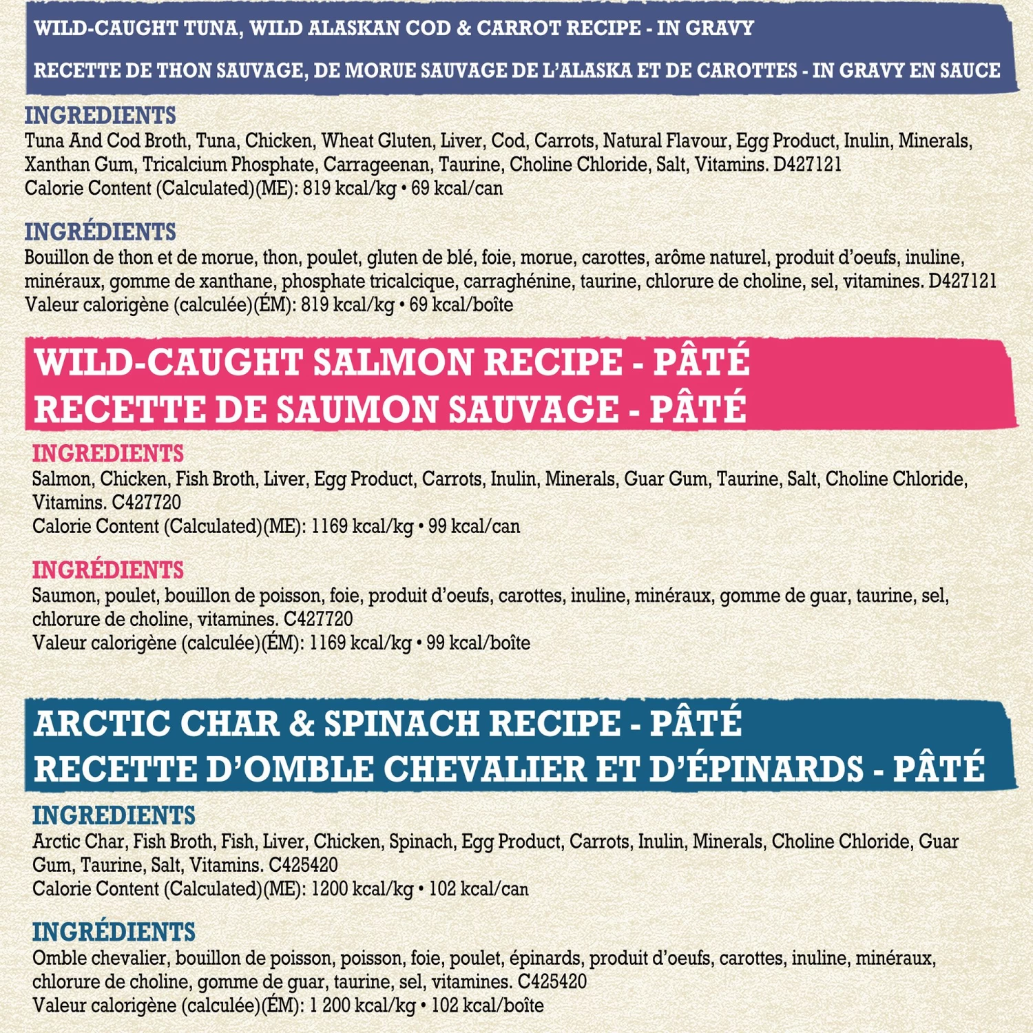 Arctic Char, Fish Broth, Fish, Liver, Chicken, Spinach, Egg Product, Carrots, Inulin, Minerals, Choline Chloride, Guar Gum, Taurine, Salt, Vitamins. C425420