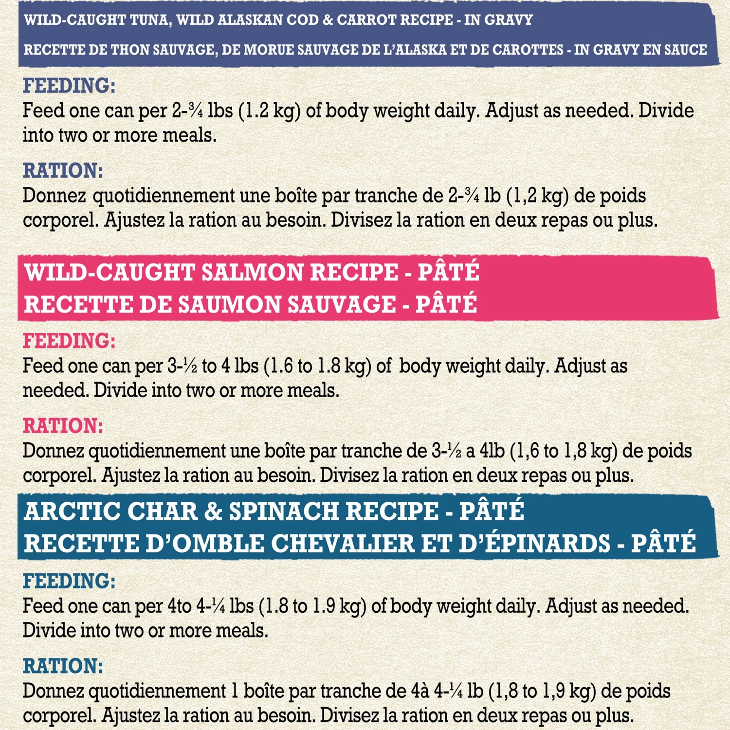 Feed one can per 2-3/4 lbs. (1.2kg) of body weight daily. Adjust as needed. Divide into two or more meals.