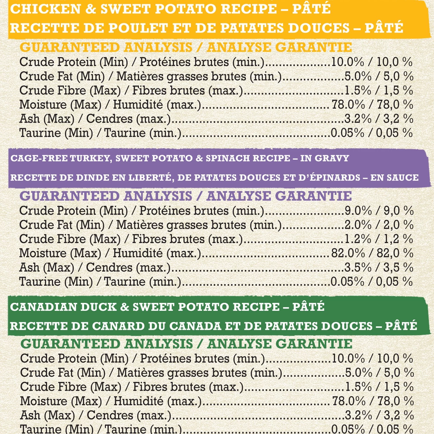 Crude Protein (Min) 10.0%, Crude Fat (Min) 5.0%, Crude Fibre (Max) 1.5%, Moisture (Max) 78.0%, Ash (Max) 3.2%, Taurine (Min) 0.05%