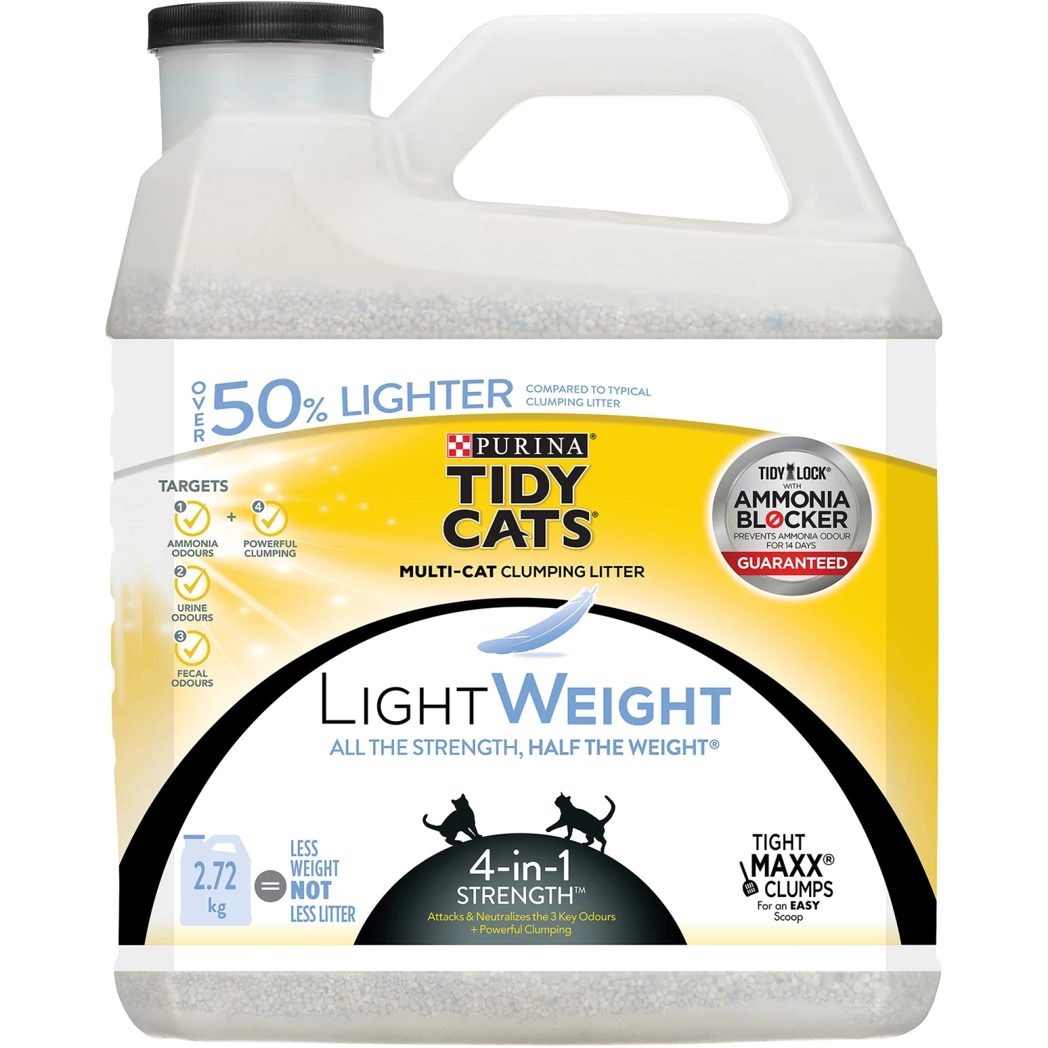 Deliver powerful odour protection with Tidy Cats 4-in-1 Strength lightweight cat litter. Formulated to attack and neutralize cat litter odour caused by ammonia, urine and fecal odours, this cat litter leaves your home smelling fresh, clean and ready for your feline friends. Formulated for households with multiple cats, this 99.9% dust free litter prevents ammonia odour for 14 days guaranteed, when used as directed. The light, powerful clumps make scooping quick and effortless, so you can spend less time tending to each cat’s litter box and more time playing with your cat companions. Tidy Cats litter is half the weight of the leading clumping cat litter, making it easy to carry, pour and store. Check litter box maintenance off your to-do list with a convenient odour-neutralizing solution.