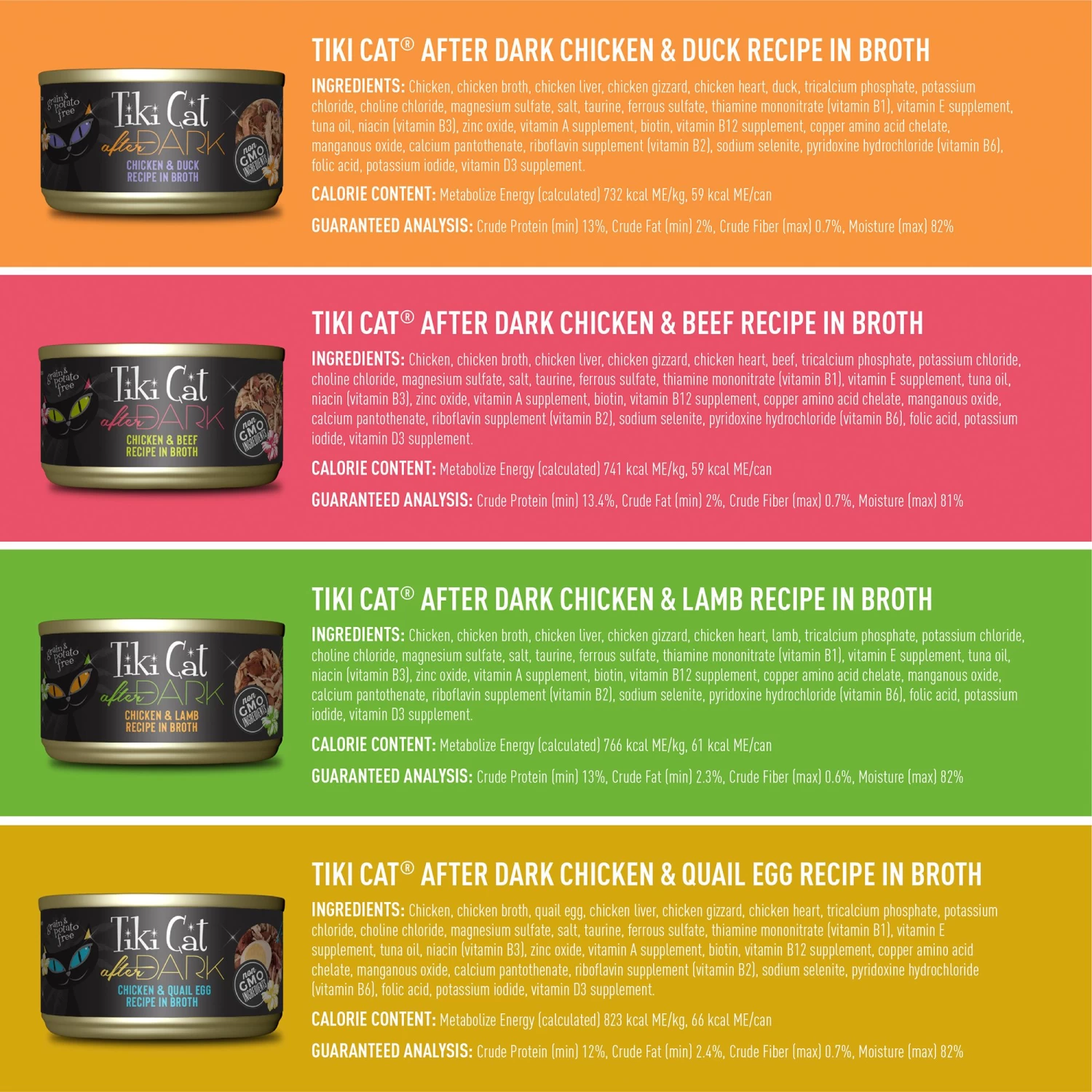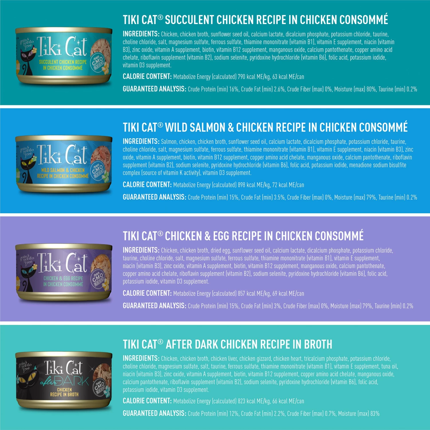 The ultimate variety pack for chicken-loving cats who prefer pates! This mega pack is carefully curated with 24 servings of 5 delicious recipes that give cats what they biologically need as obligate carnivores: high protein from real animal sources, high moisture for supplemental hydration, and nutritional variety. Included are 2 Tiki Cat Luau Pate recipes with chicken and tuna, and 3 Tiki Cat After Dark Pate recipes with chicken and duck or quail egg, plus morsels of flavorful, nutrient-dense organ meats. Treat your cat to a different chicken pate at every meal!