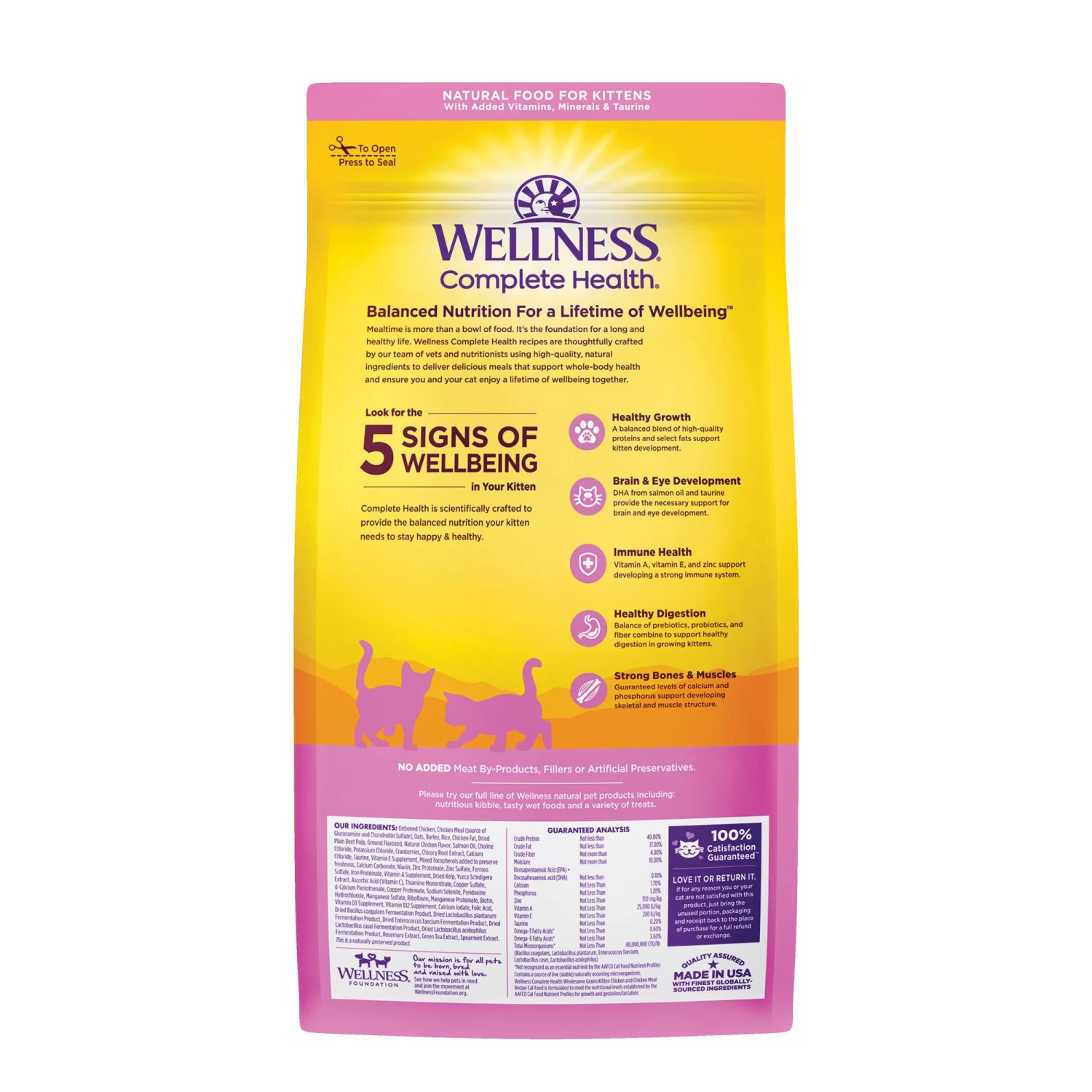 Wellness Complete Health Kitten Recipe is formulated with a balanced blend of delicious, high-quality proteins and select fats for healthy growth in addition to added DHA from Salmon Oil and Taurine to support brain and eye development. Guaranteed levels of calcium and phosphorus help develop skeletal and muscle structure, and Vitamin A, Vitamin E and zinc are included to help support a strong immune system for your kitten.