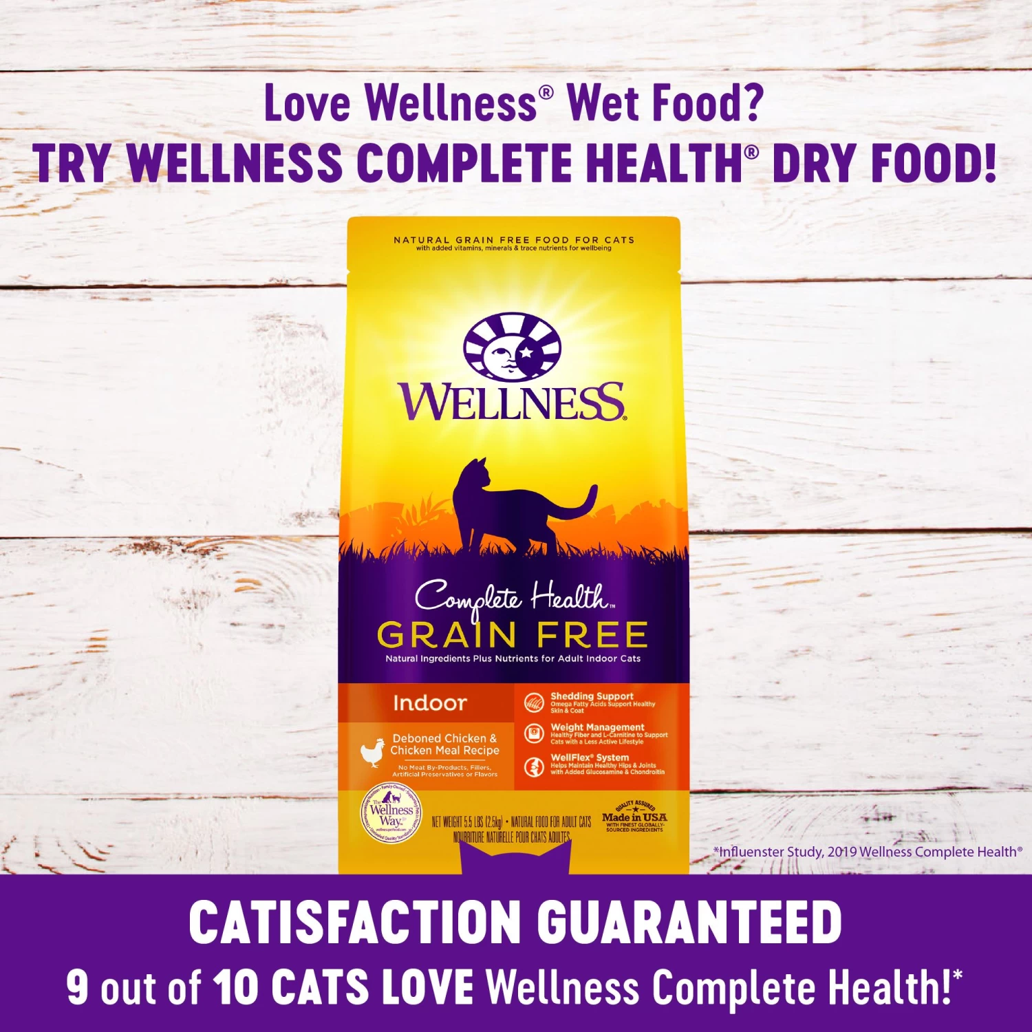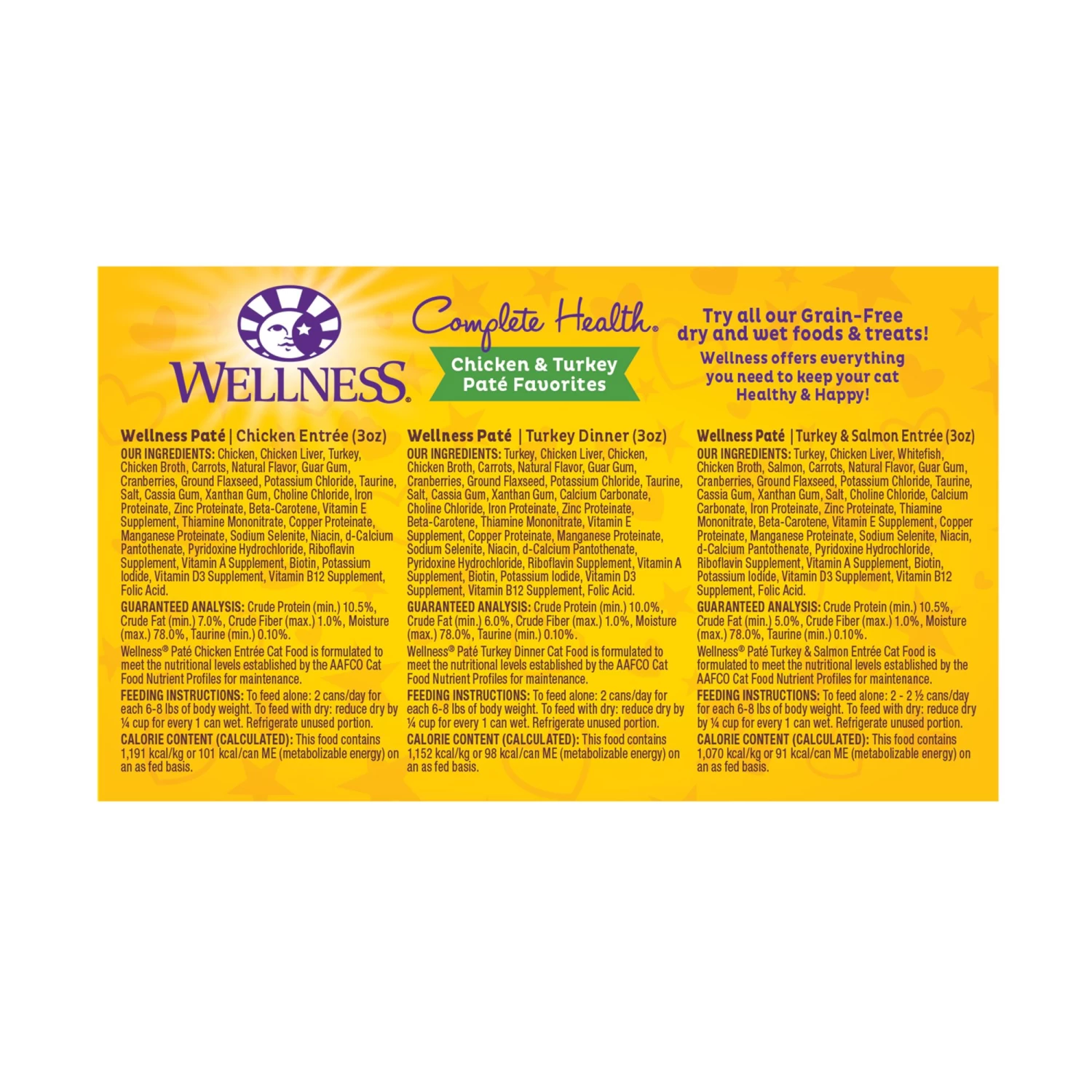 Wellness Complete Health Natural Grain Free Wet Cat Food Variety Pate Recipes are healthy, natural cat foods for adult cats with excellent sources of protein and essential fatty acids for complete and balanced nutrition. They’re made with high quality proteins and include other key ingredients like flaxseed and carrots, essential vitamins and minerals, and cranberries which are added to help maintain proper urinary tract health. In addition, hydration is extremely important to a cat’s overall health and since cats do not have a strong thirst drive, Wellness Complete Health wet canned cat food recipes are a delicious and healthy way to increase your cat’s moisture intake.