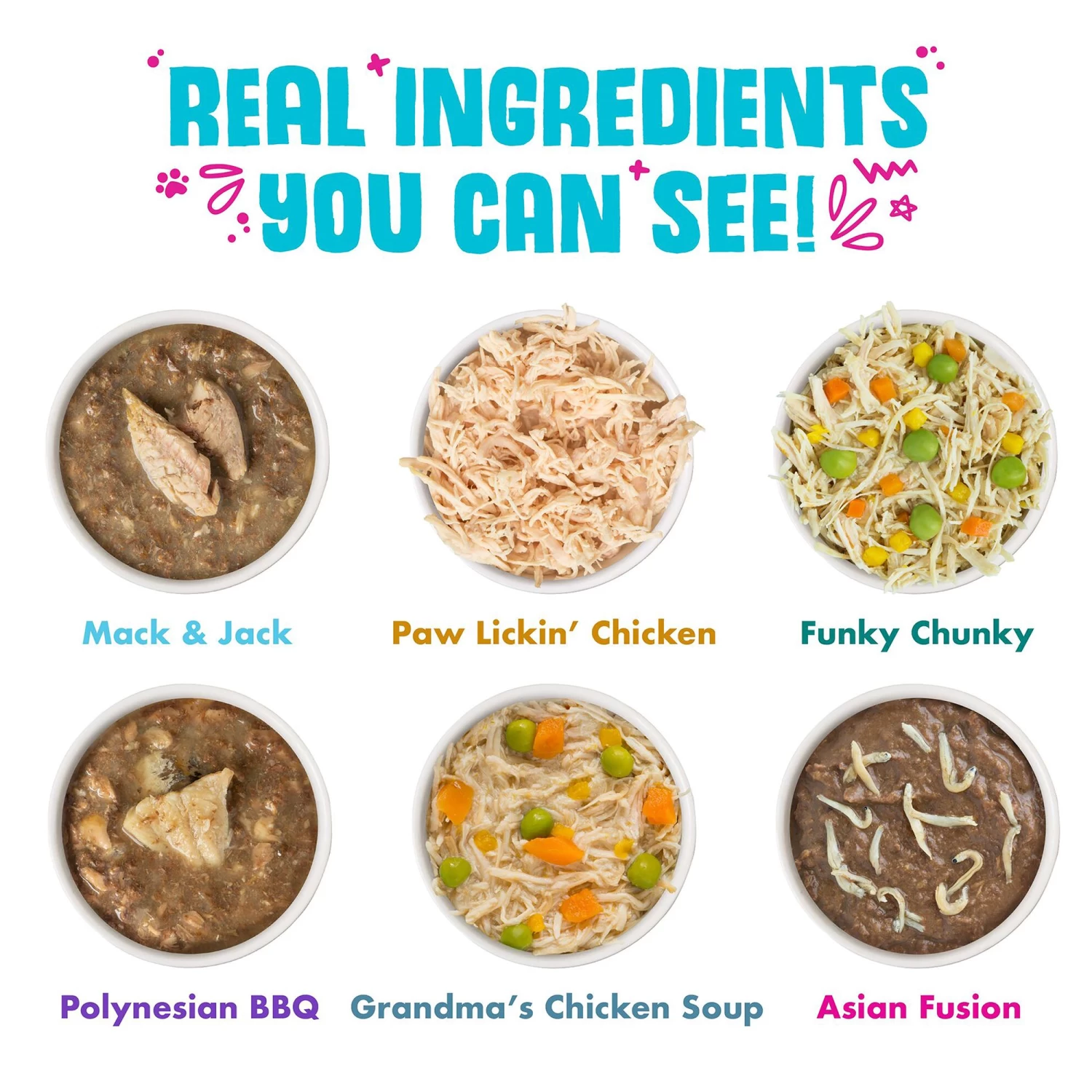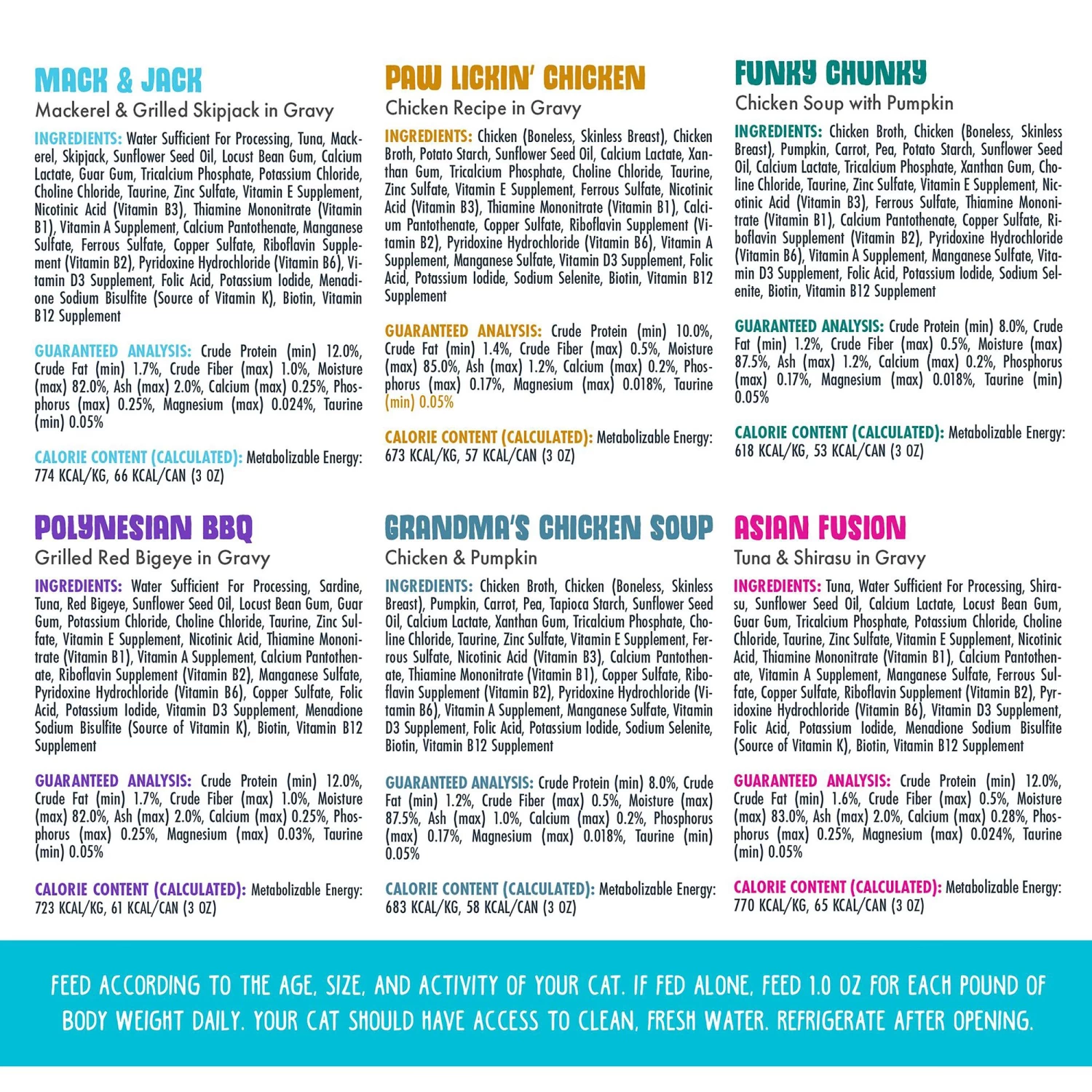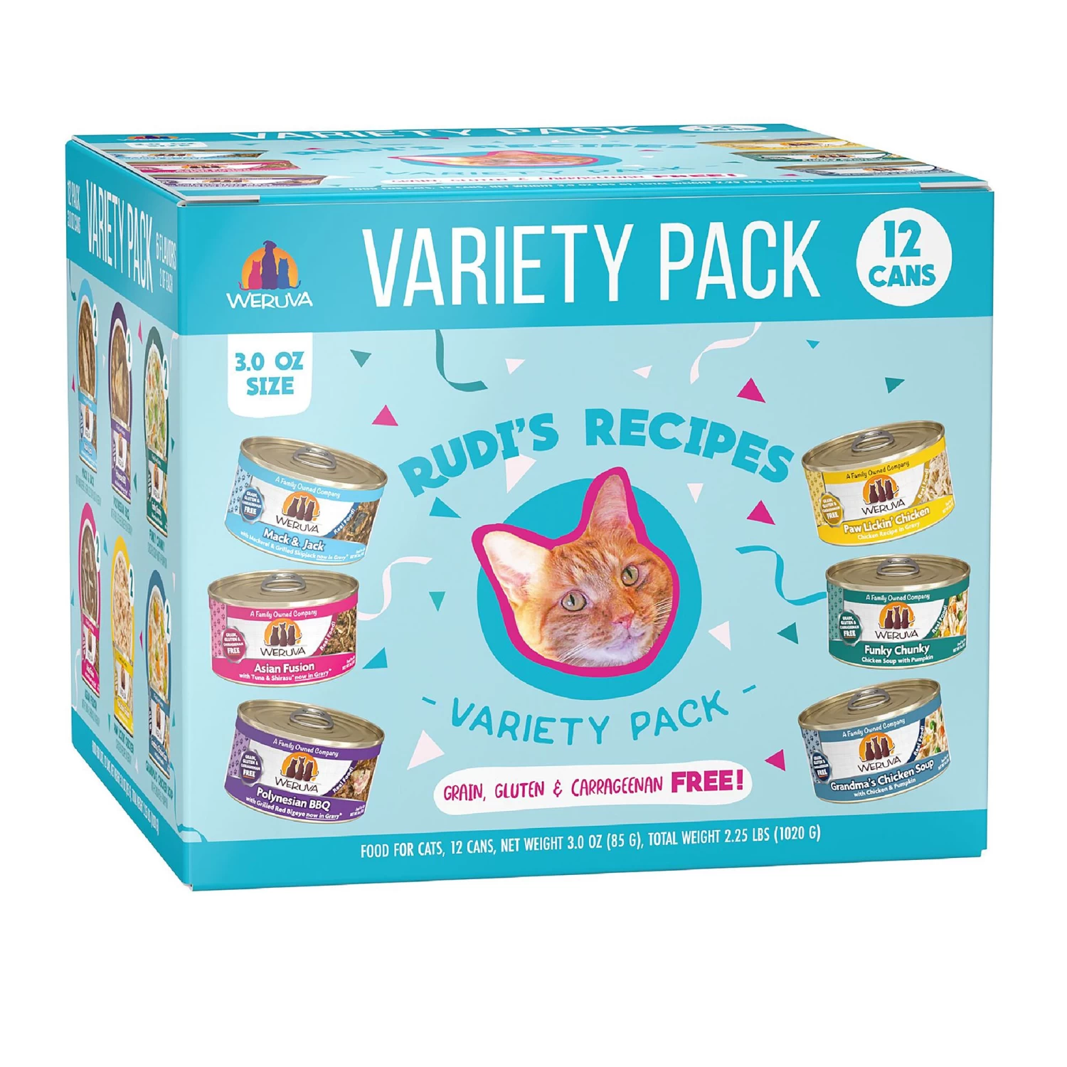 Flavor: Rudi&339;s Recipes Variety Pack includes: Paw Lickin’ Chicken – Chicken in Gravy, Grandma’s Chicken Soup – Chicken & Pumpkin, Funky Chunky – Chicken Soup with Pumpkin, Mack & Jack – Grilled Sjipjack in Gravy, Asian Fusion – Tuna and Shirasu in Gravy ,Polynesian BBQ – Grilled Red Bigete in Gravy