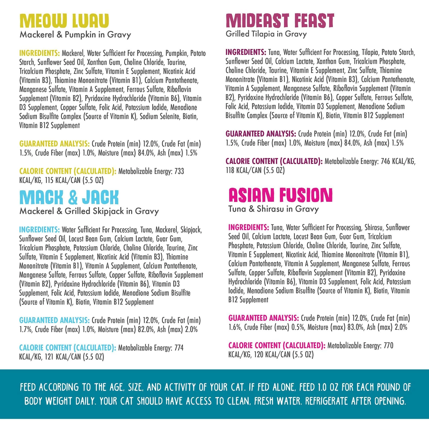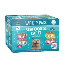 Flavor: Seafood & Eat It Variety Pack includes: Mideast Feast – Grilled Tilapia in Gravy, Mack & Jack – Mackerel & Grilled Skipjack in Gravy, Asian Fusion – Tuna & Shirasu in Gravy, Meow Luau – Mackerel & Pumpkin in Gravy