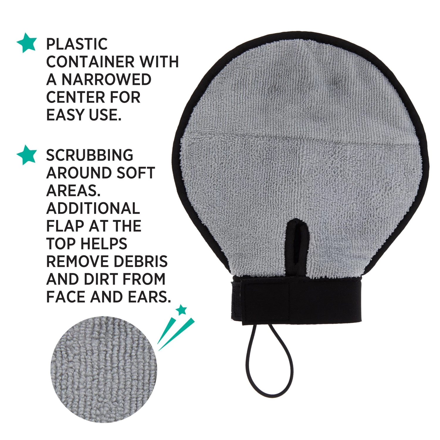 For bath time use. Use textured rubber side to massage shampoo/conditioner into cat’s fur and evenly disperse intocoat. Use terry cloth side to clean the small areas around the eyes, mouth, and ears.