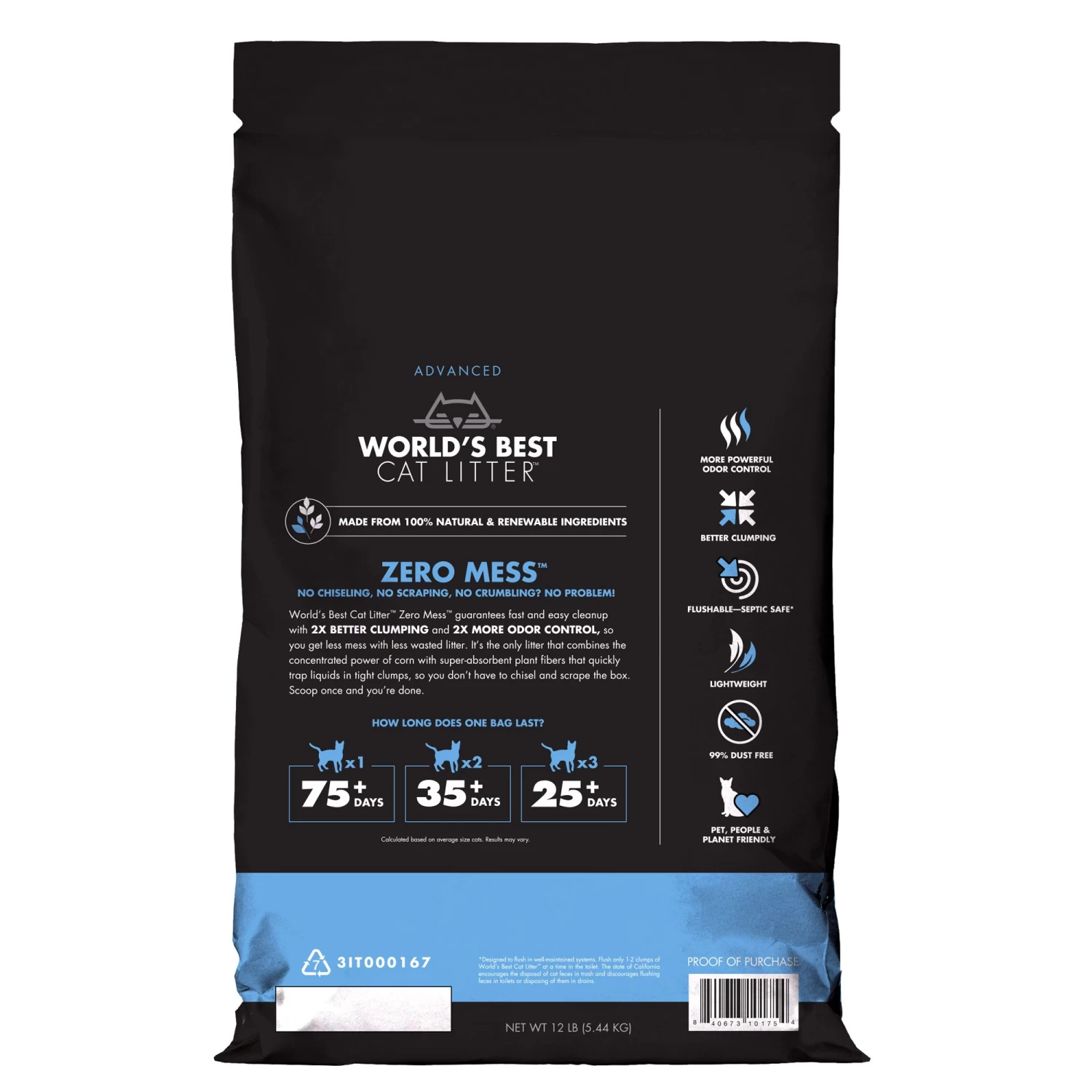 Stop odors and dust from your cat’s litter box in their tracks with World’s Bet Cat Litter Zero Mess with Concentrated Power Litter. This amazing litter acts quickly and powerfully to snuff out odors, and is virtually dust-free. Meanwhile, its clumping nature and the fact that it is even safe to flush make cleaning litter boxes a breeze.